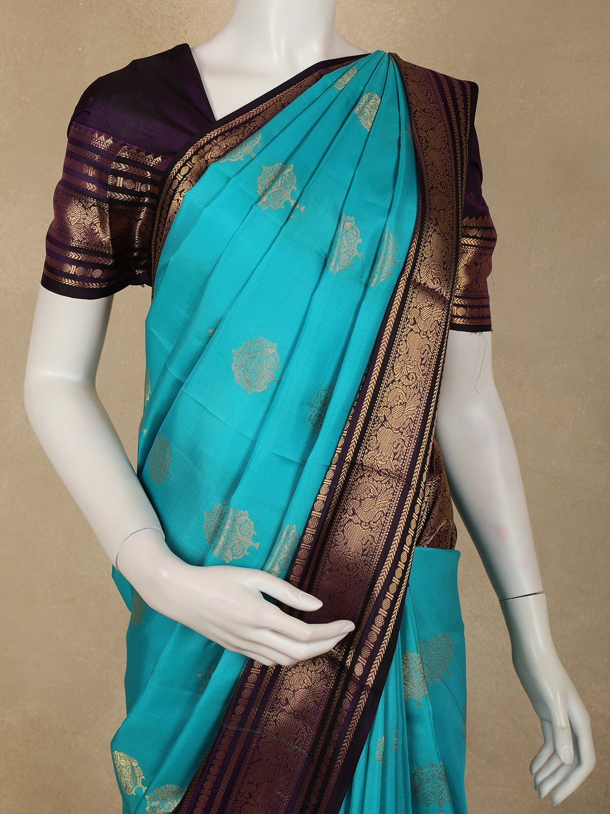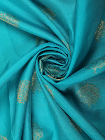 Radiating timeless elegance, this Aqua Blue Floral Butta Woven Design Pure Kanchipuram Silk Saree is a perfect blend of tradition and sophistication. The serene aqua blue body is beautifully adorned with delicate gold zari floral butta motifs, evenly woven across the saree to add a graceful shimmer and classic charm.