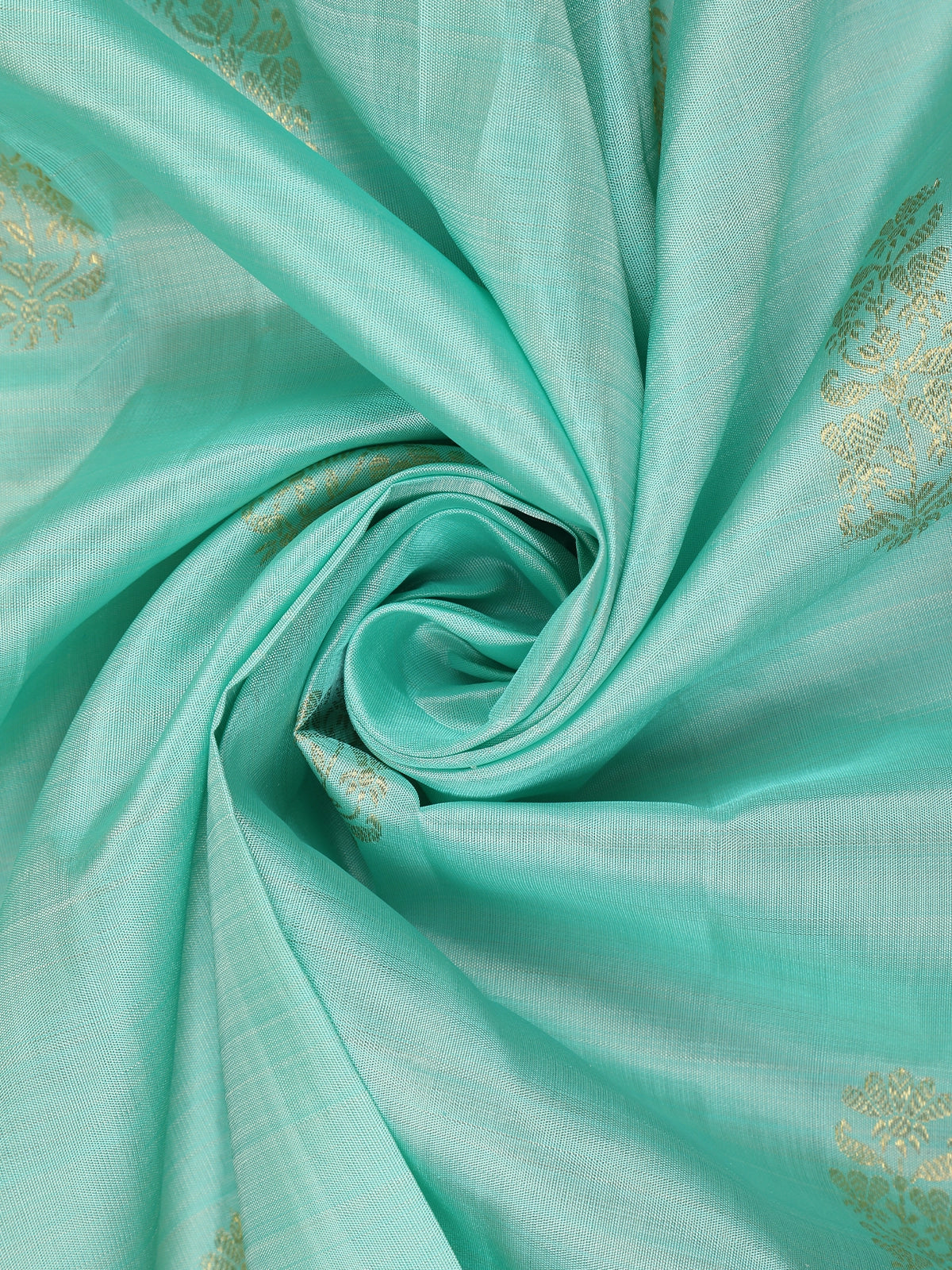 Gracefully elegant and refreshingly vibrant, this Aqua Blue Pure Kanchipuram Silk Saree is adorned with delicate gold zari buttas that add a subtle shimmer across the rich silk base. The soft yet striking shade of aqua gives the saree a youthful and radiant charm.