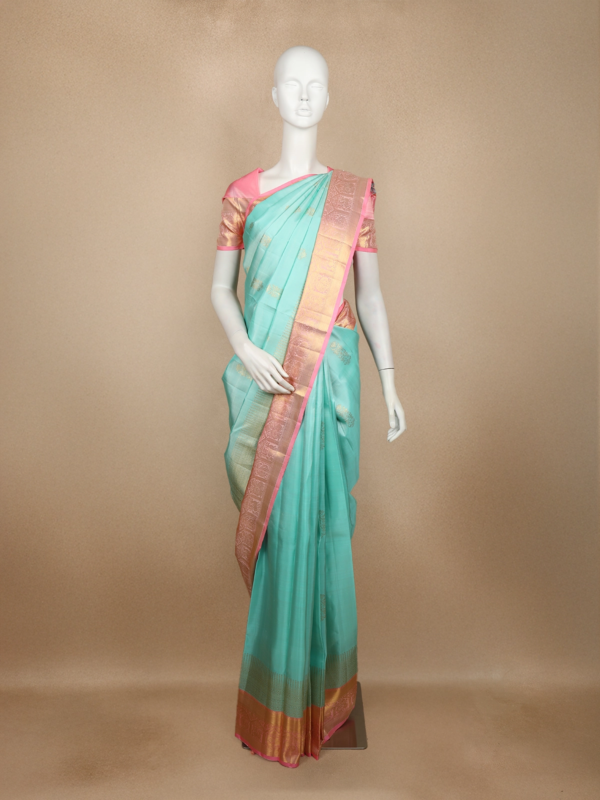 Aqua Blue Floral Butta Woven Pure Kanchipuram Silk Saree with Contrast Pink Zari Border