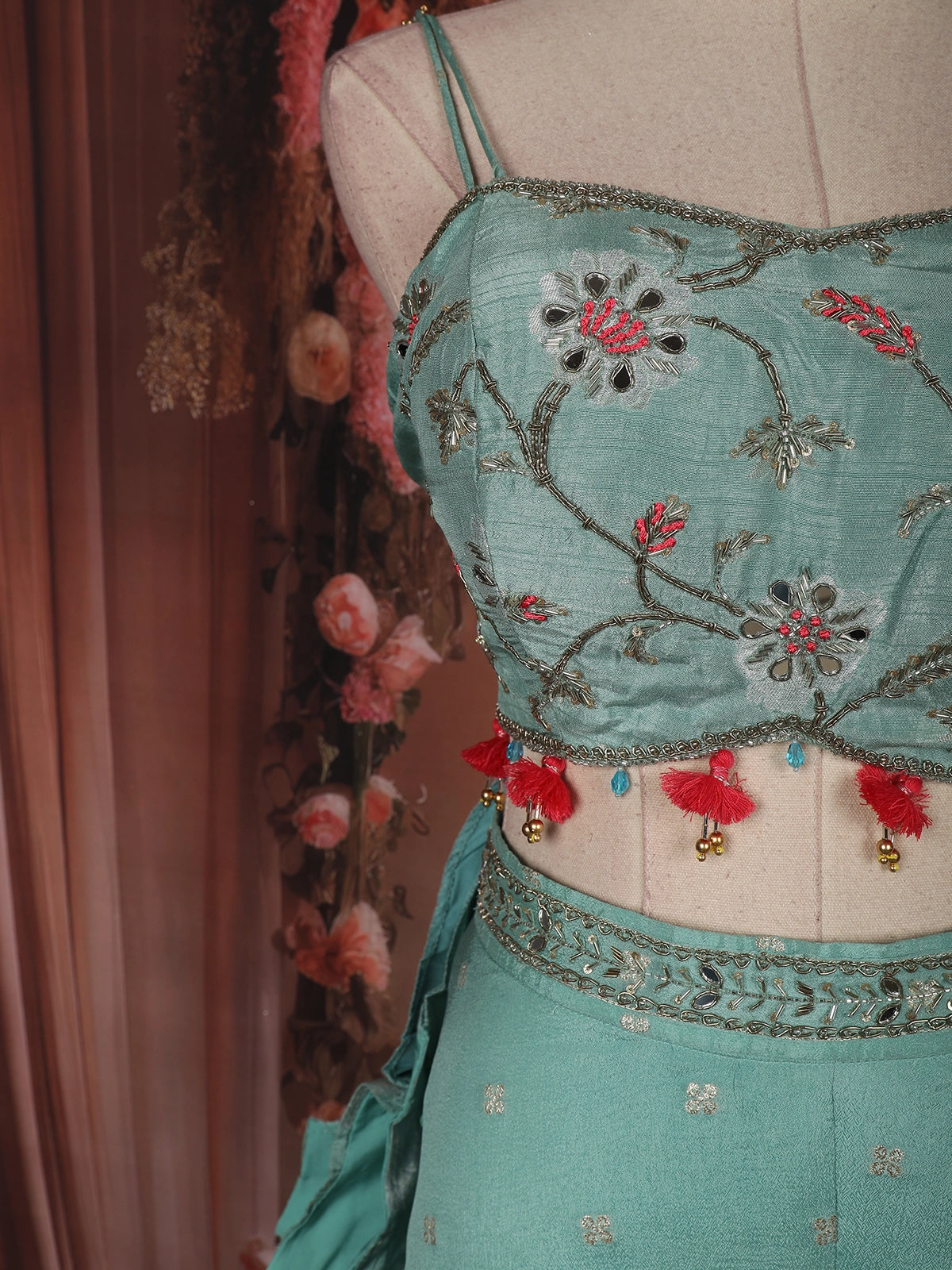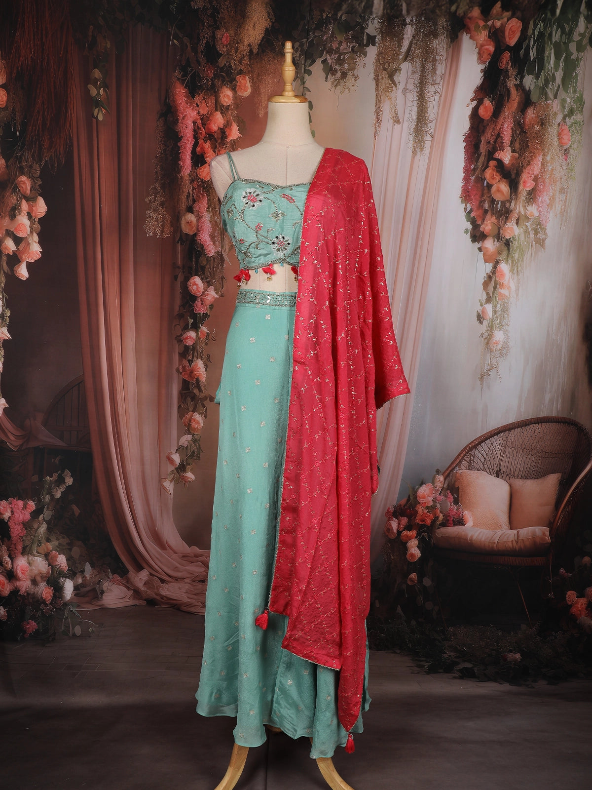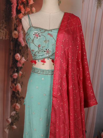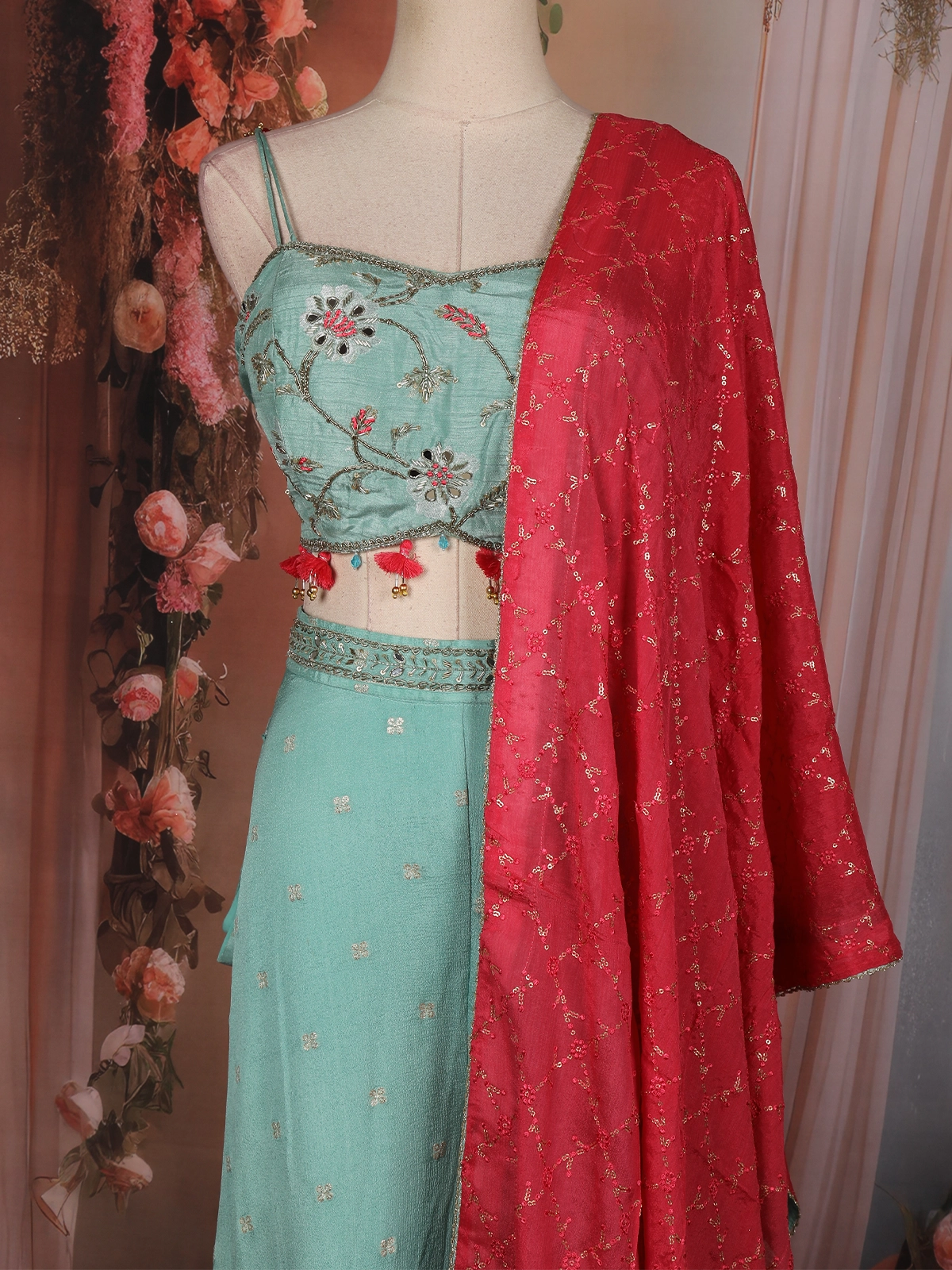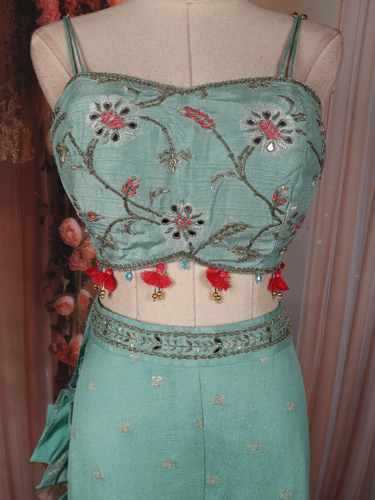 Refresh your festive wardrobe with this elegant Aqua Blue Floral Embroidered Georgette Palazzo Suit, designed to blend graceful tradition with contemporary charm. The sleeveless crop-style top features delicate floral thread embroidery enhanced with subtle mirror accents, creating a refined festive shimmer. Slim shoulder straps and a structured silhouette add a modern edge, while the playful tassel detailing at the hem lends a youthful, stylish finish.