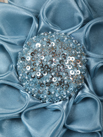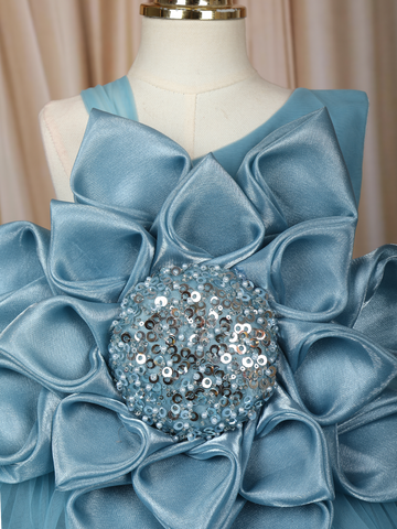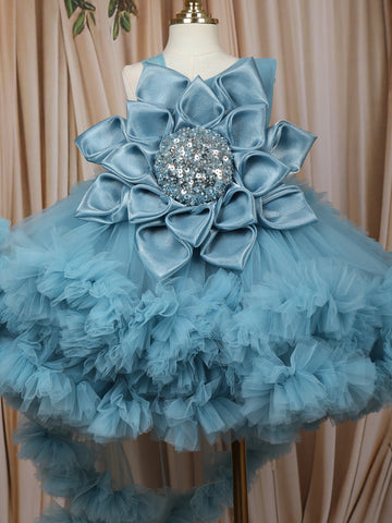 Let your little one sparkle like a star in this stunning Aqua Blue Floral Layered Net Ruffle Frock, crafted to bring out her inner princess. The frock features a captivating oversized 3D floral appliqué at the bodice, artistically designed with satin petals and a shimmering sequin-embellished centerpiece, adding a touch of glamour and uniqueness to the outfit.