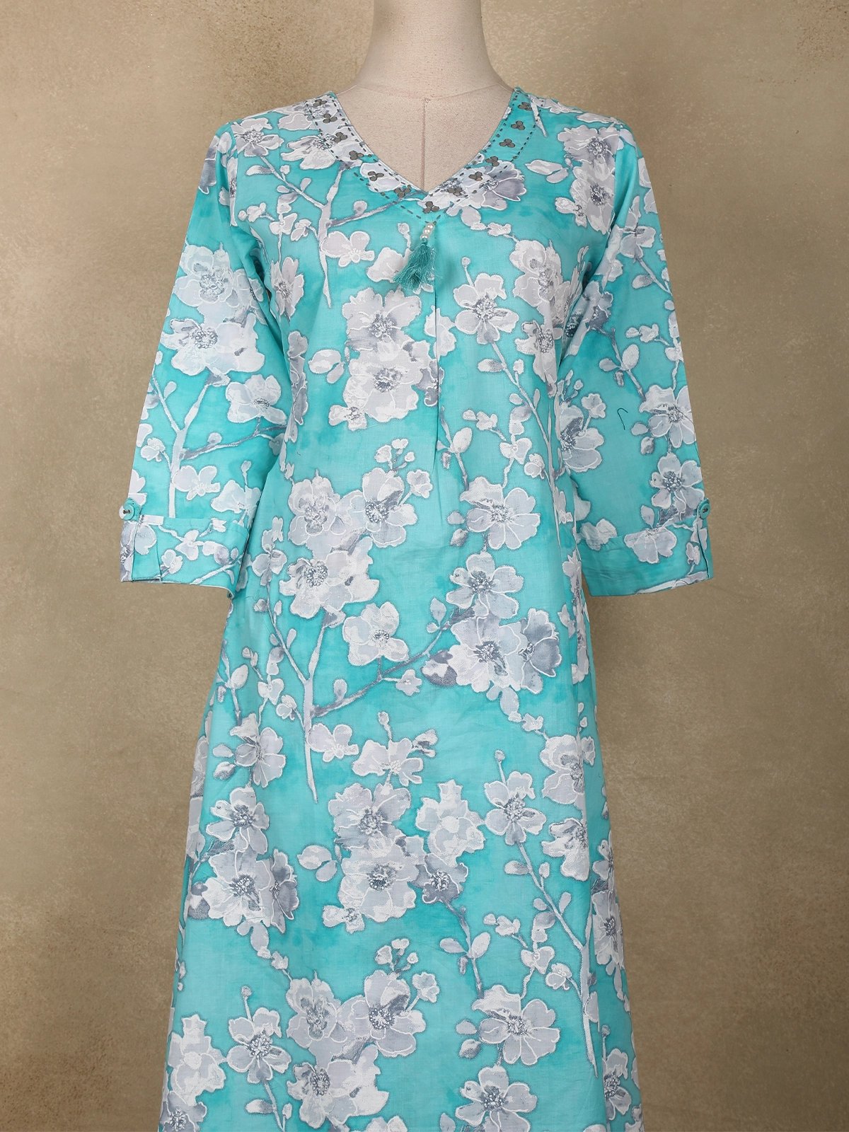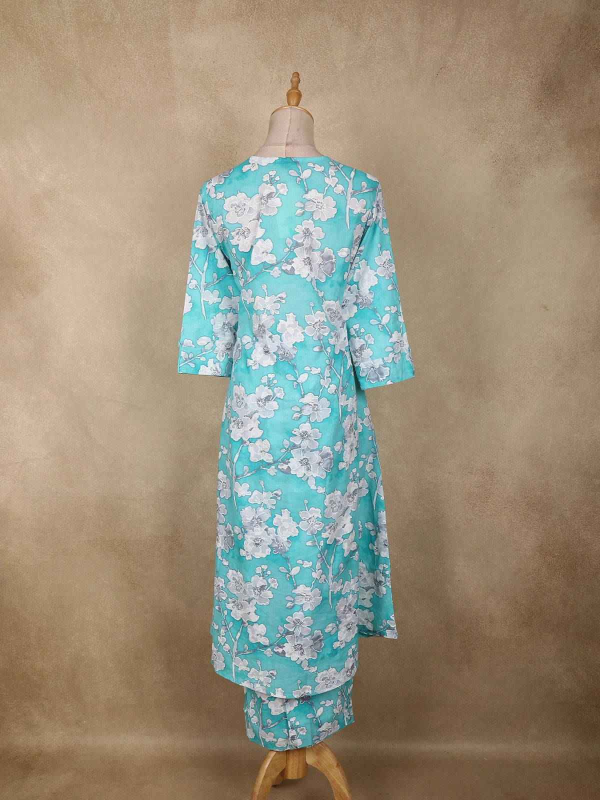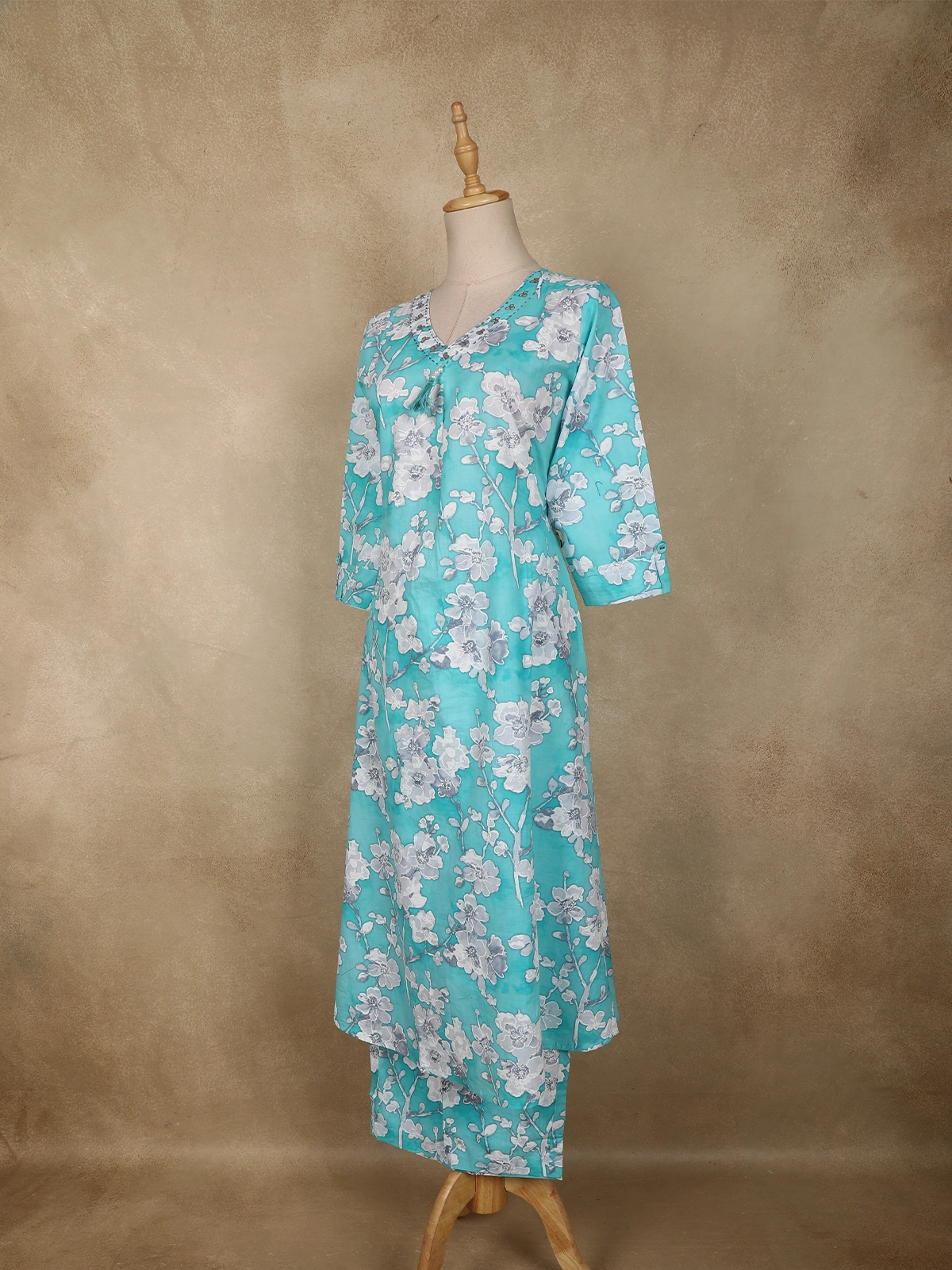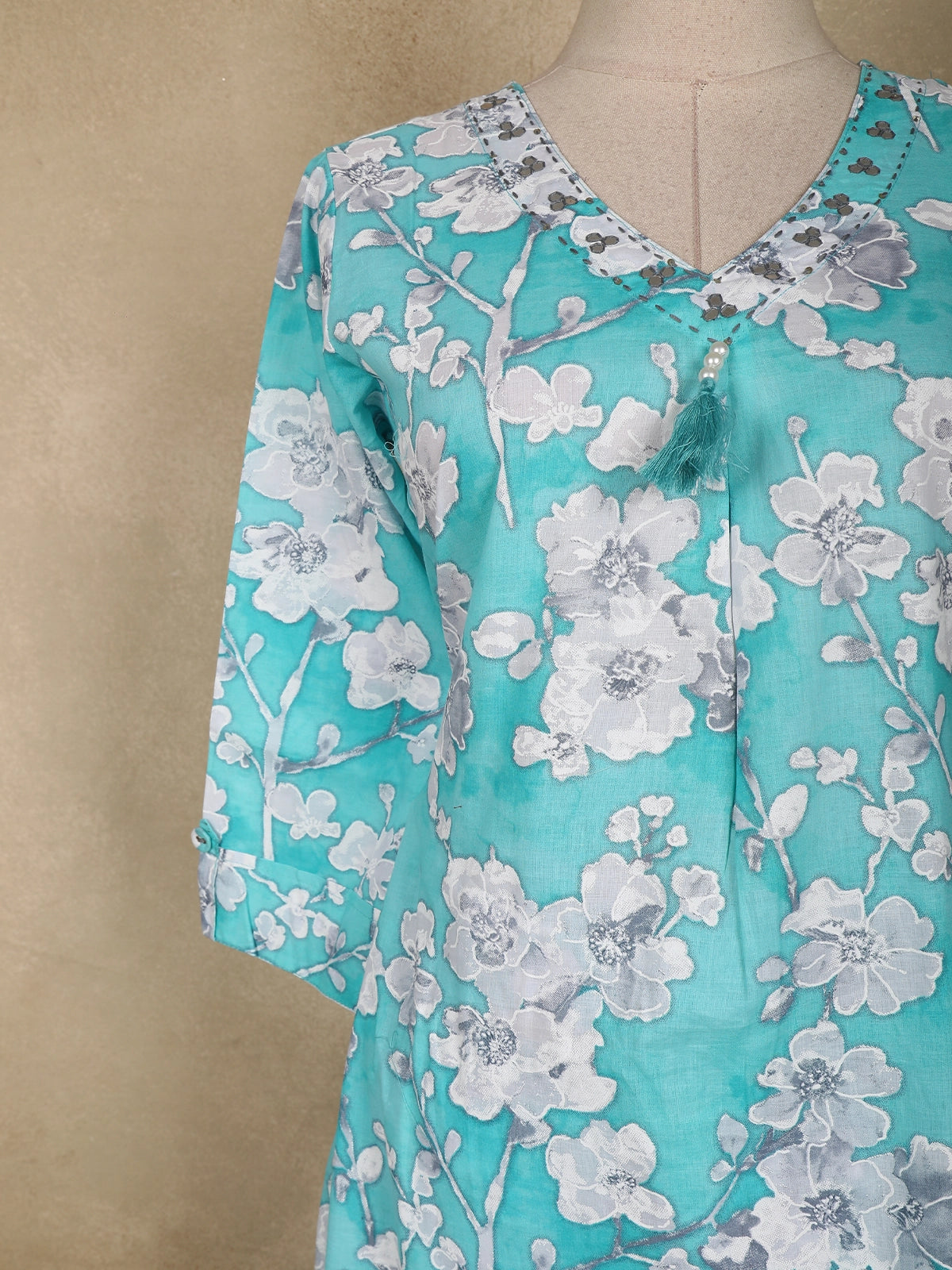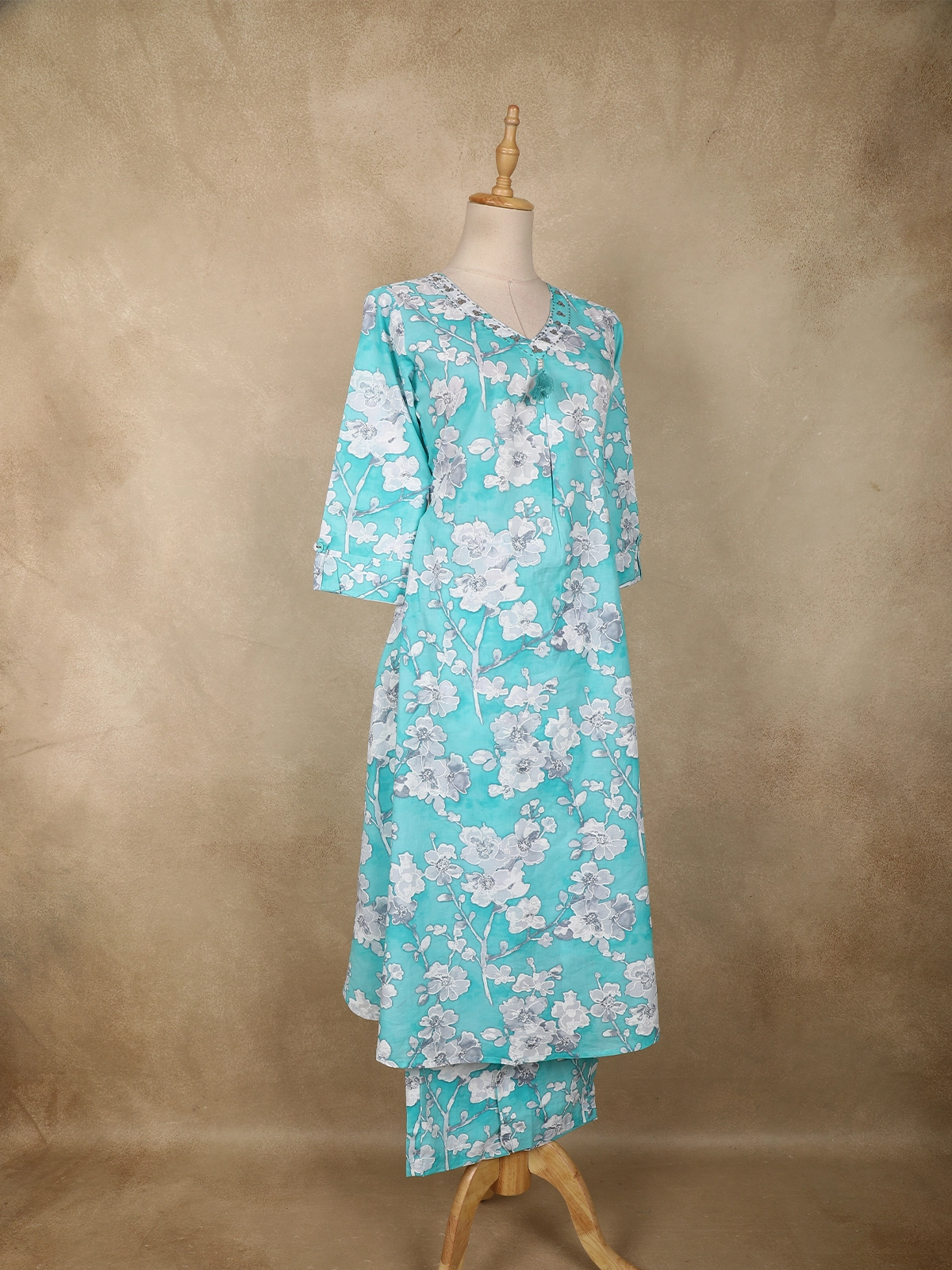 Aqua Blue Floral Printed Design Cotton Co-ord Set