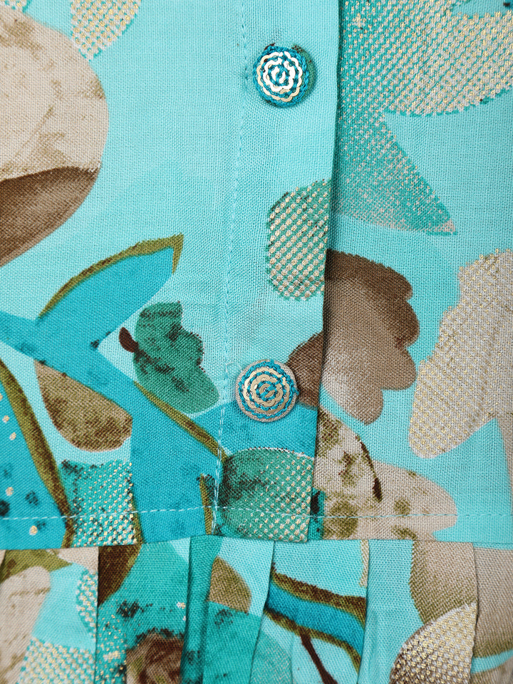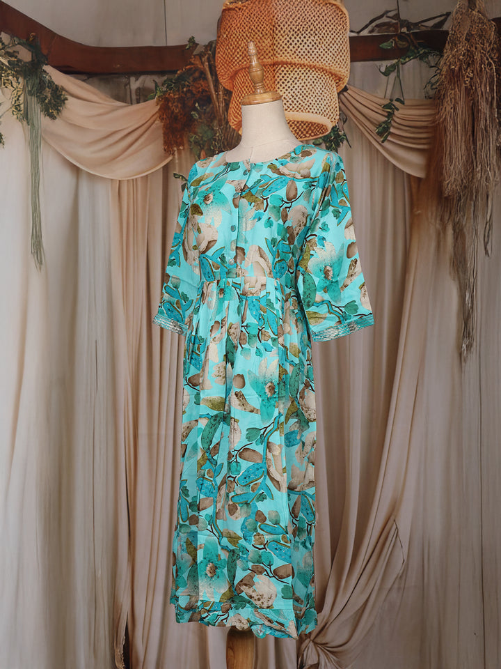 The soothing aqua blue hue serves as the perfect canvas for its delicate floral prints in earthy tones, giving it a refreshing and graceful appeal. The round neckline and 3/4 sleeves lend a modest yet elegant silhouette, while the straight-cut design offers a flattering and easy-to-wear fit for all body types.