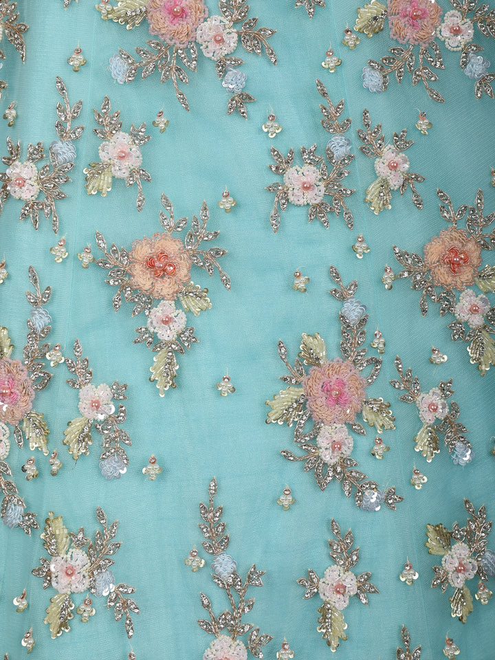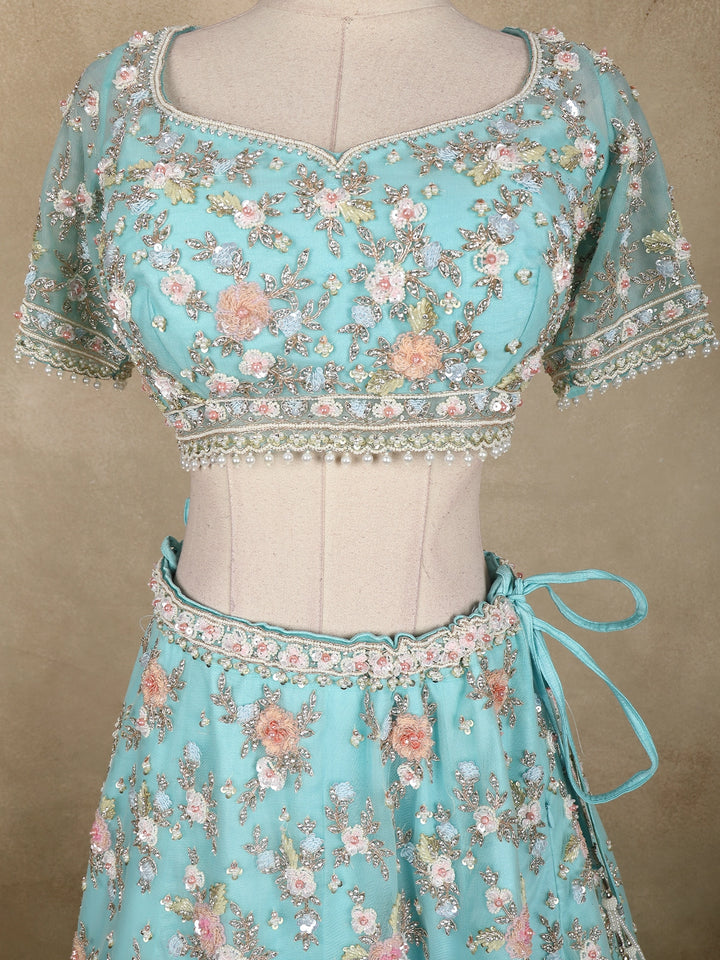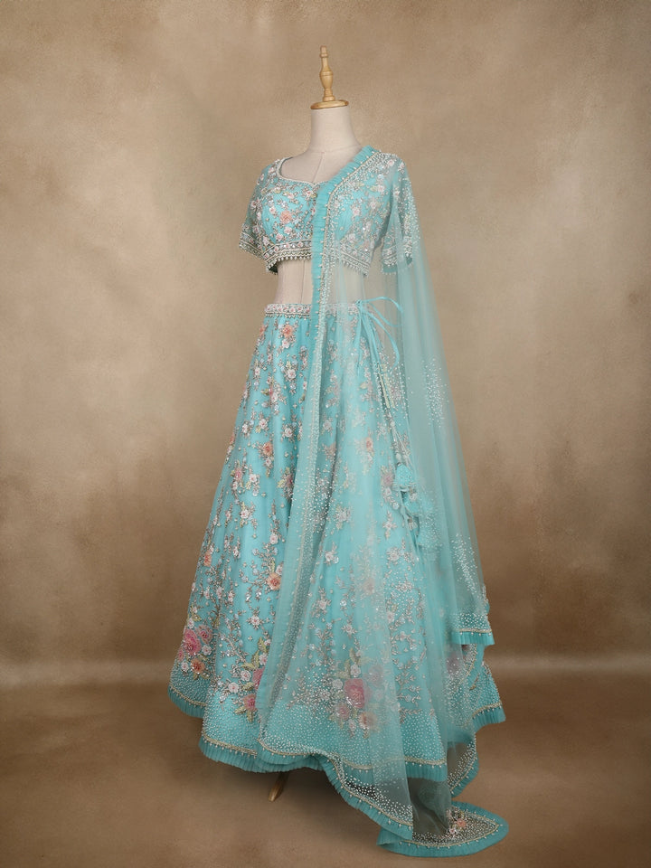 Aqua Blue Floral Sequins and Beads Embroidered Design Net Lehenga With Dupatta