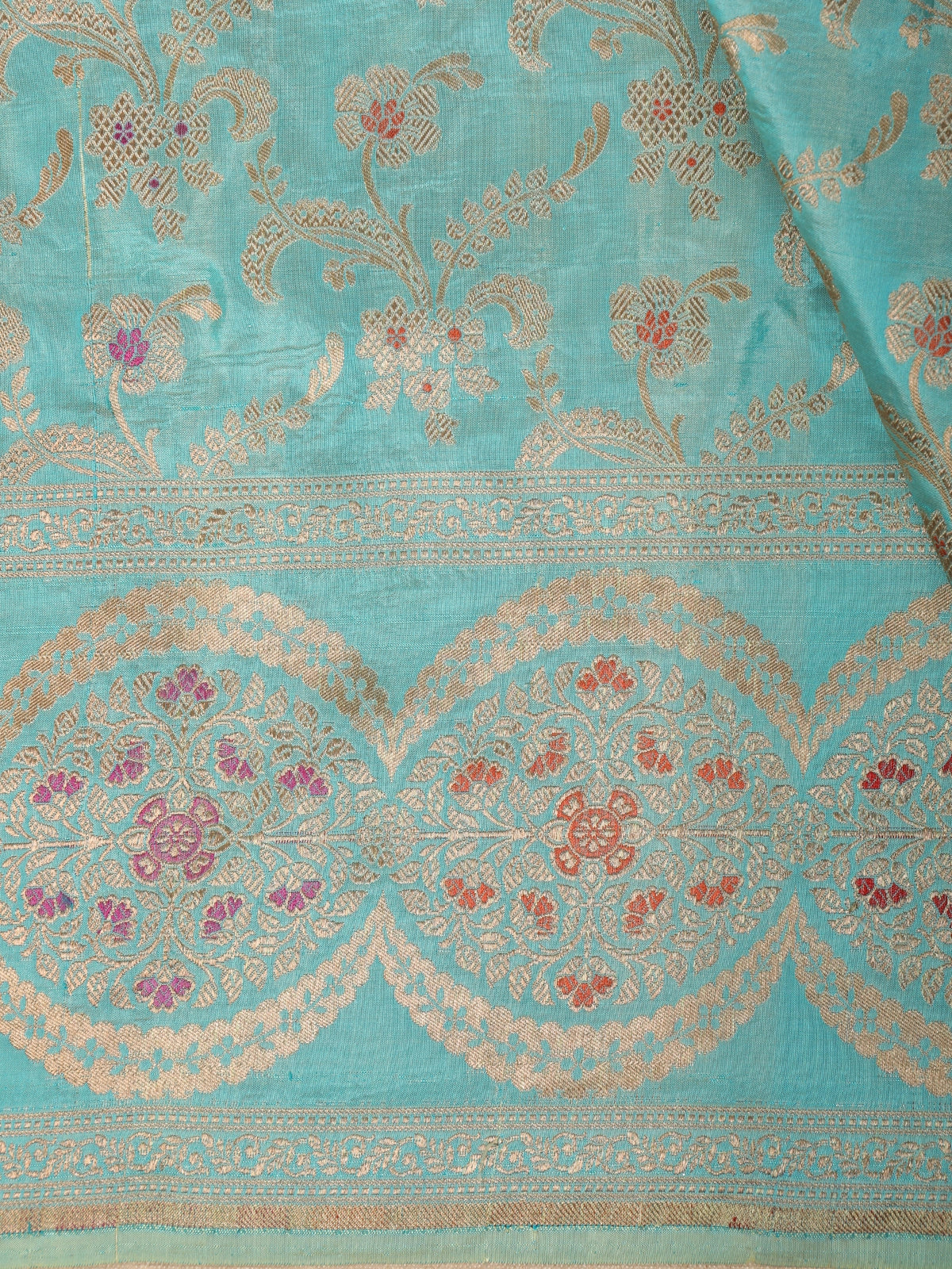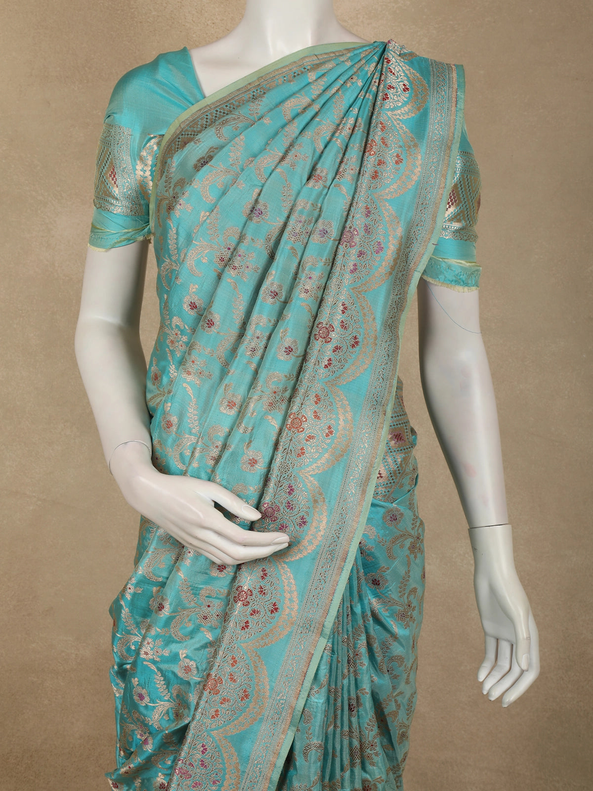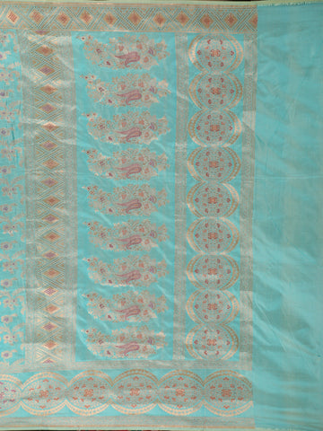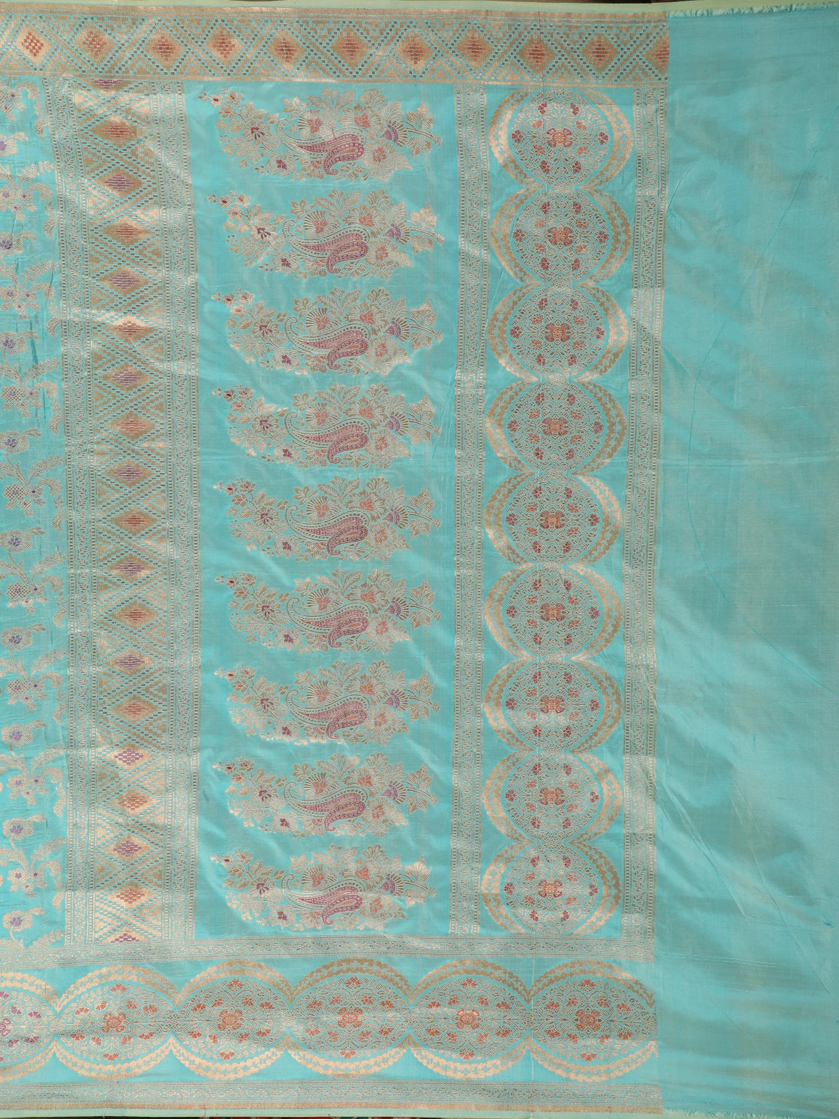 Aqua Blue Floral Zari Woven Design Pure Banarasi Silk Saree with Zari Border