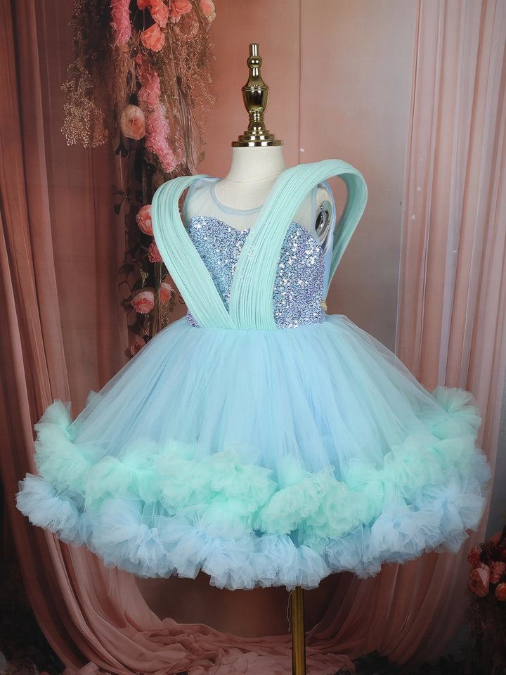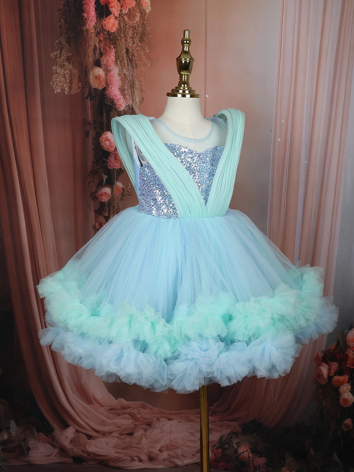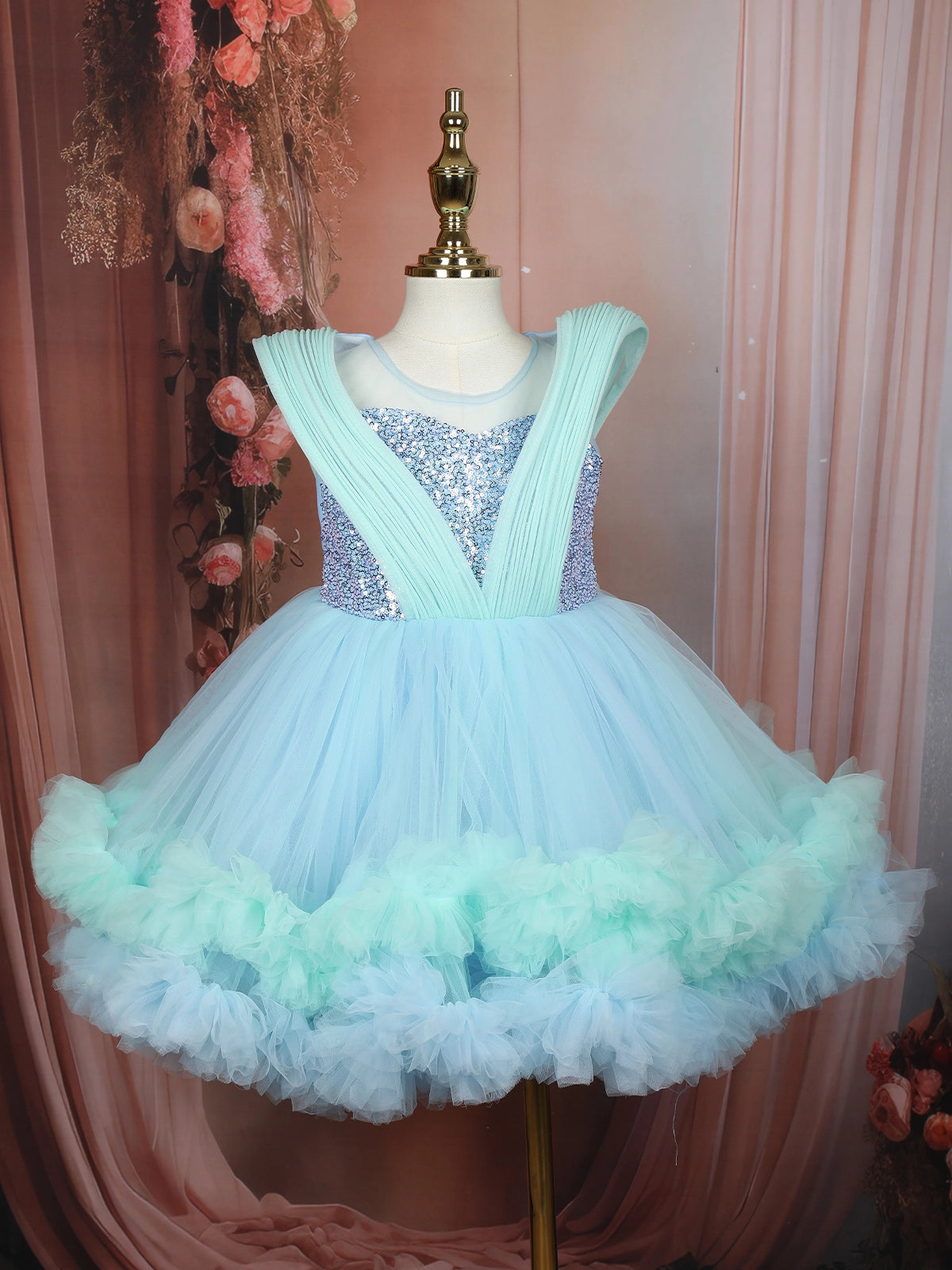 Dress your little princess in pure fairytale elegance with this mesmerizing Aqua Blue Party Wear Frock. Designed with a delightful blend of sparkle and volume, this outfit is perfect for birthdays, celebrations, and every magical moment in between!