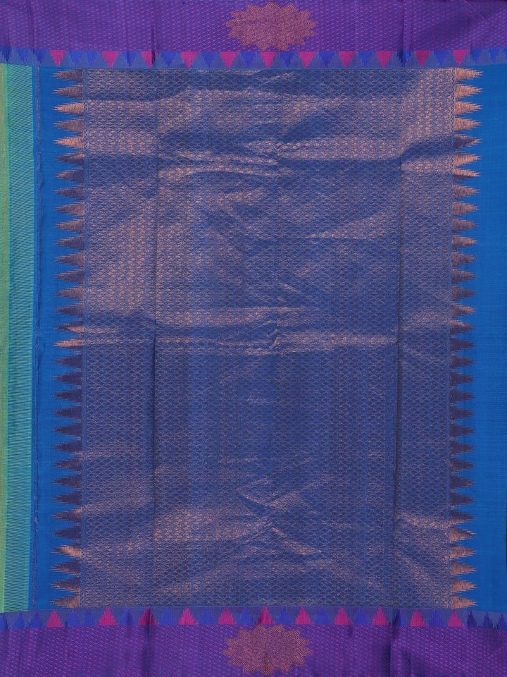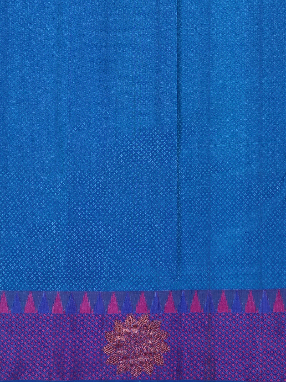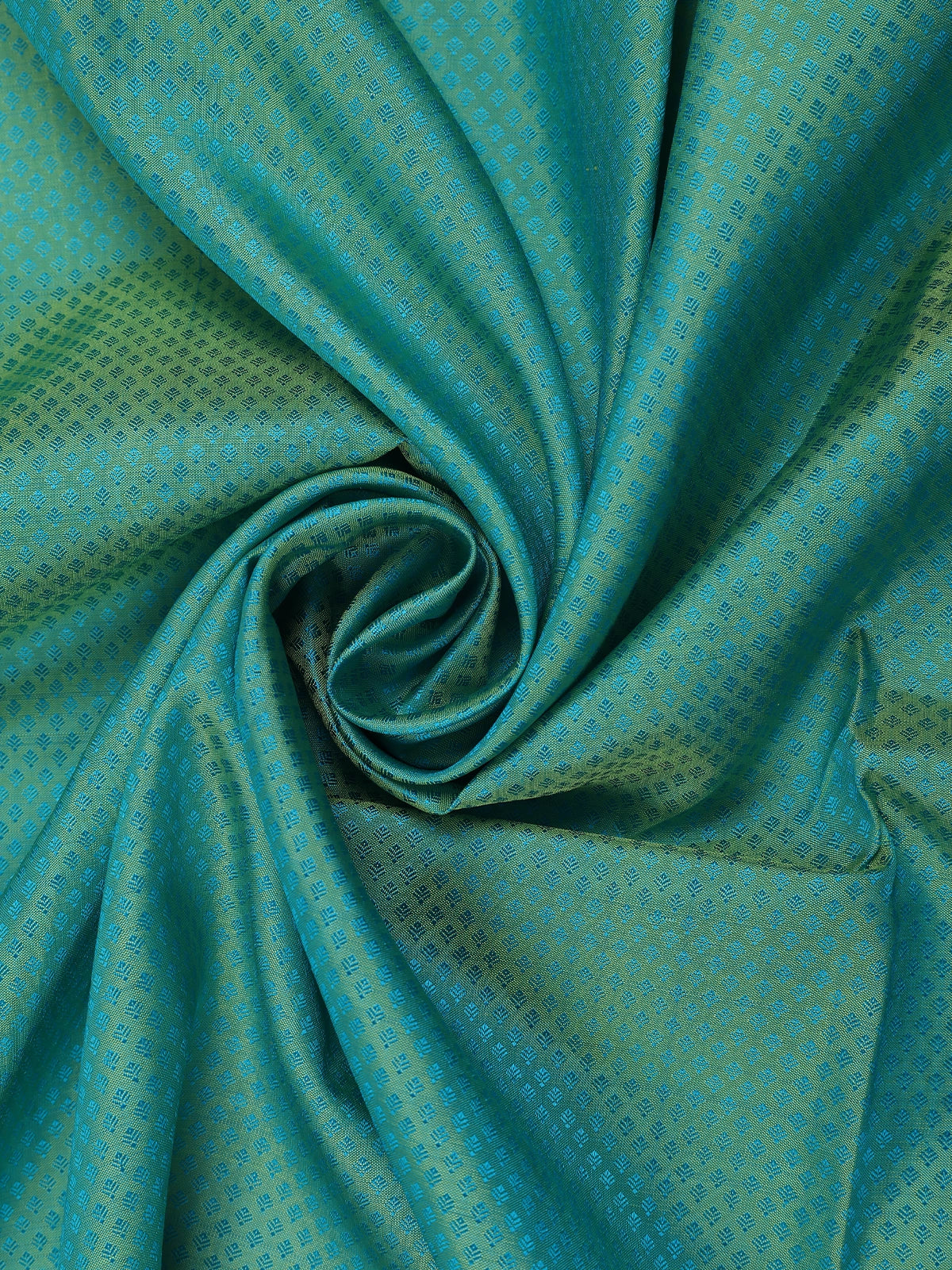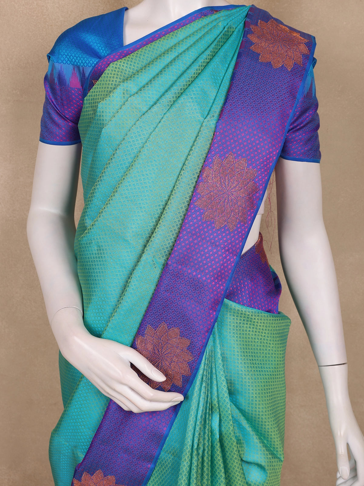 The aqua green base brings a refreshing touch of sophistication, while the contrast blue pallu and blouse add a regal dual-tone finish, perfect for weddings and grand festivities. The rich zari border enhances its royal appeal, lending a traditional yet luxurious charm to the ensemble.