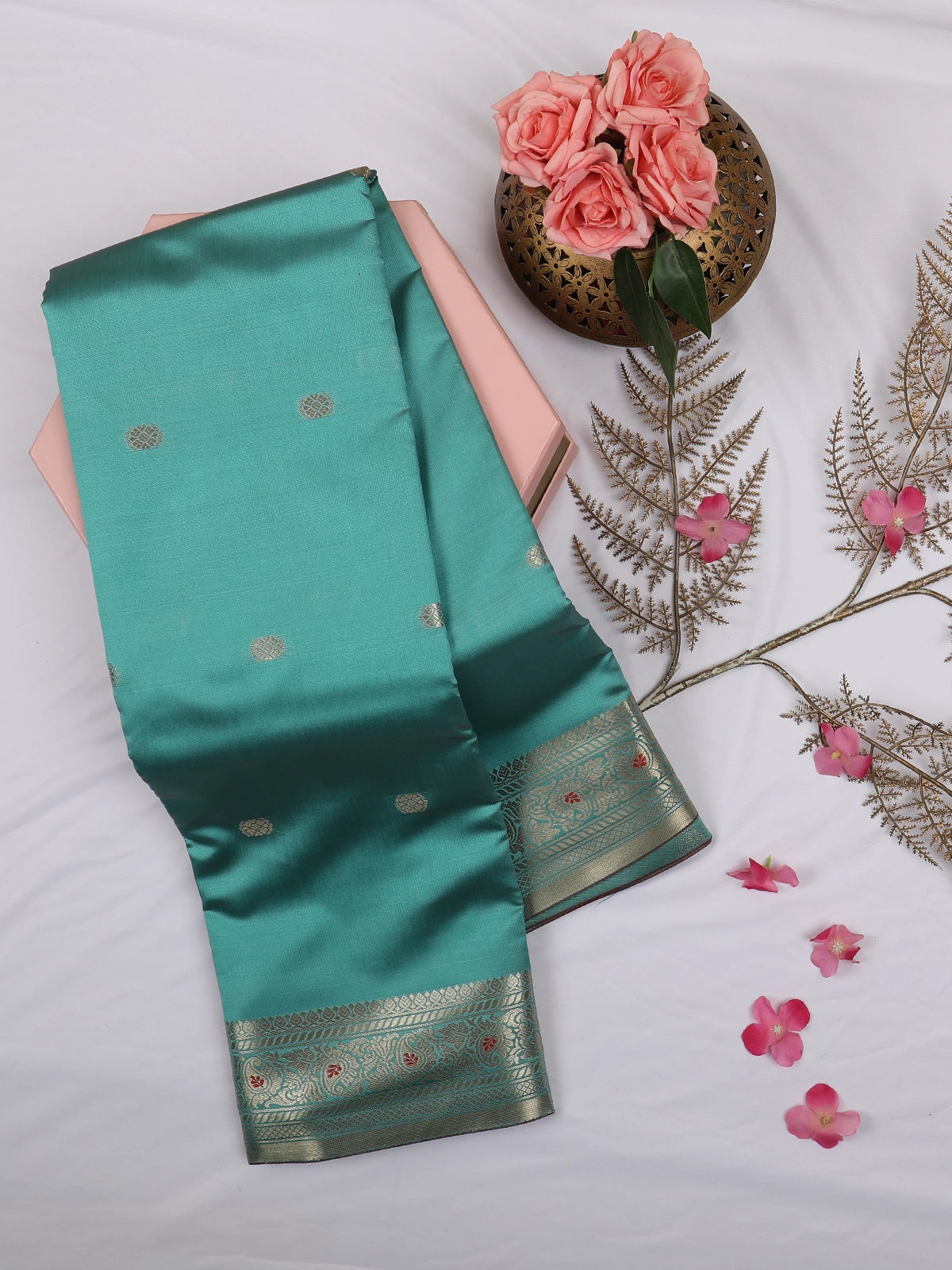 Elevate your ethnic wardrobe with this exquisite aqua green soft silk saree, crafted to offer a naturally lustrous finish and an elegant, fluid drape. The body features delicate woven gold butta motifs, adding a subtle sparkle that enhances the saree's traditional charm without overpowering its refined simplicity.