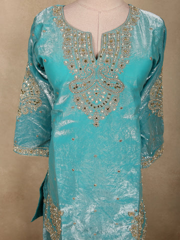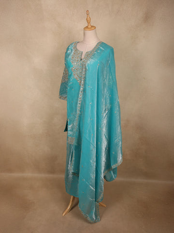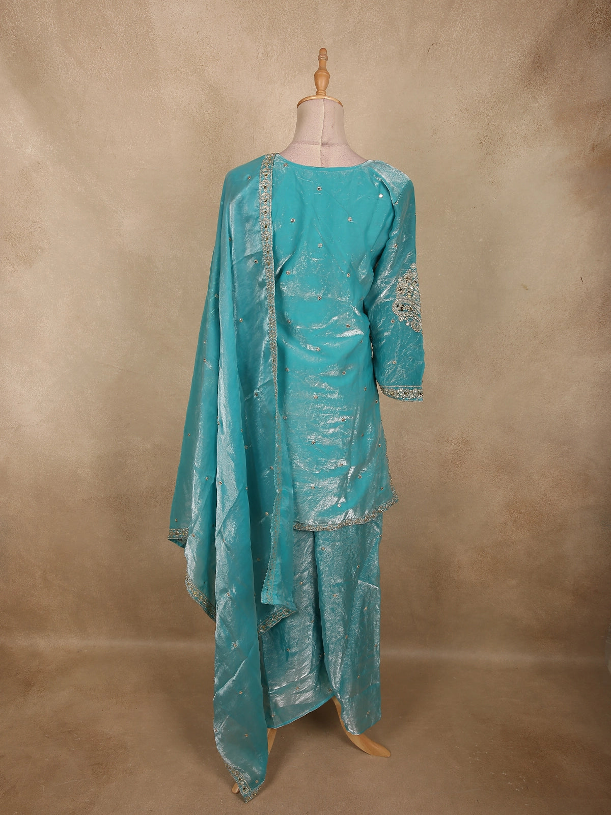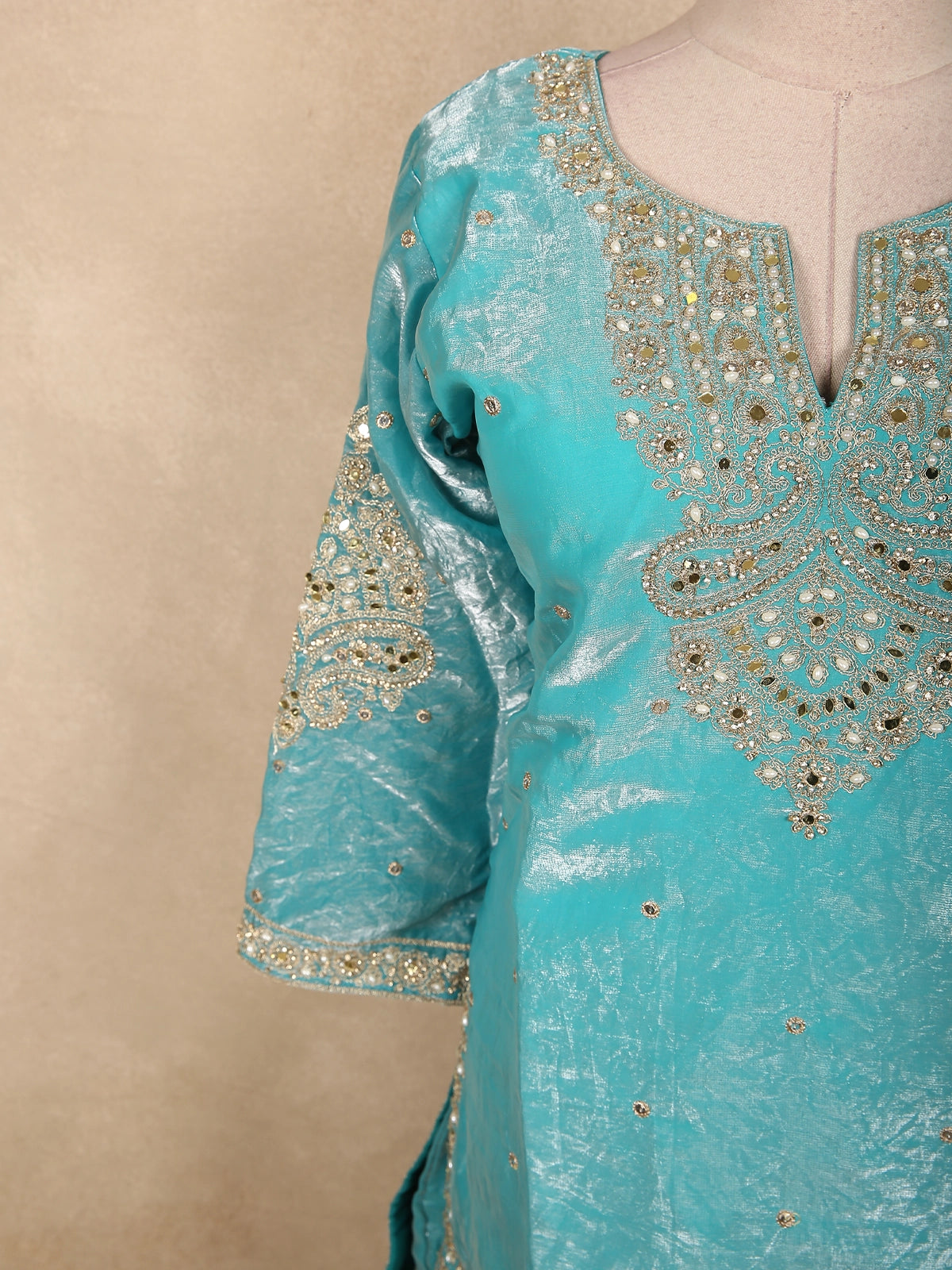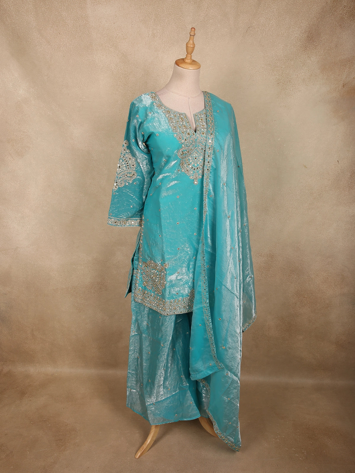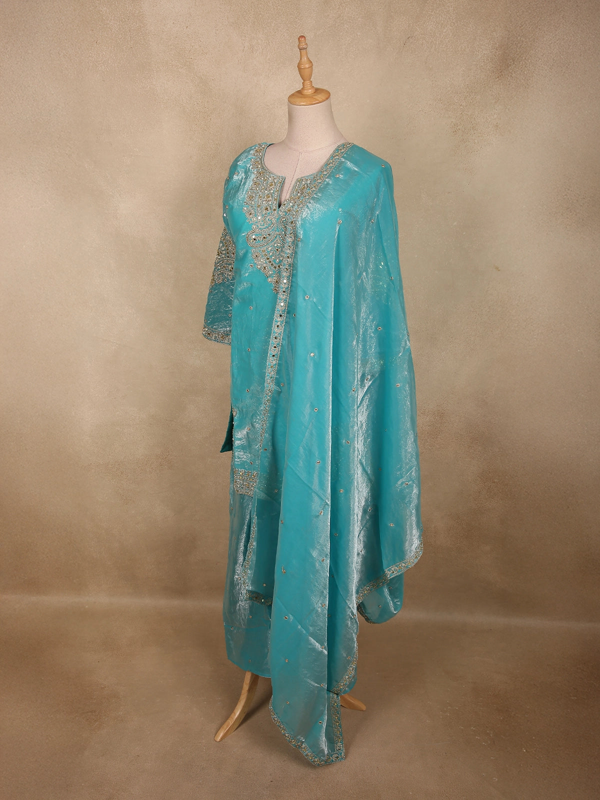 Fresh, elegant, and effortlessly festive, this sharara suit is crafted in a luminous aqua teal blue shade that radiates vibrancy and grace. The airy organza fabric is finished with a subtle sheen, lending the ensemble a light, fluid drape that feels both luxurious and comfortable.