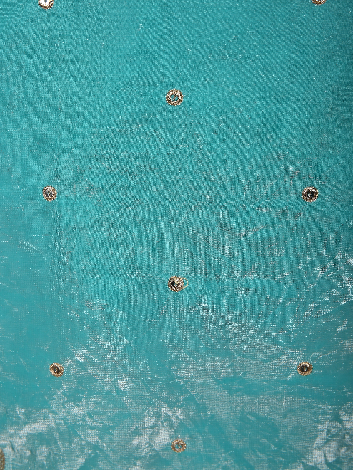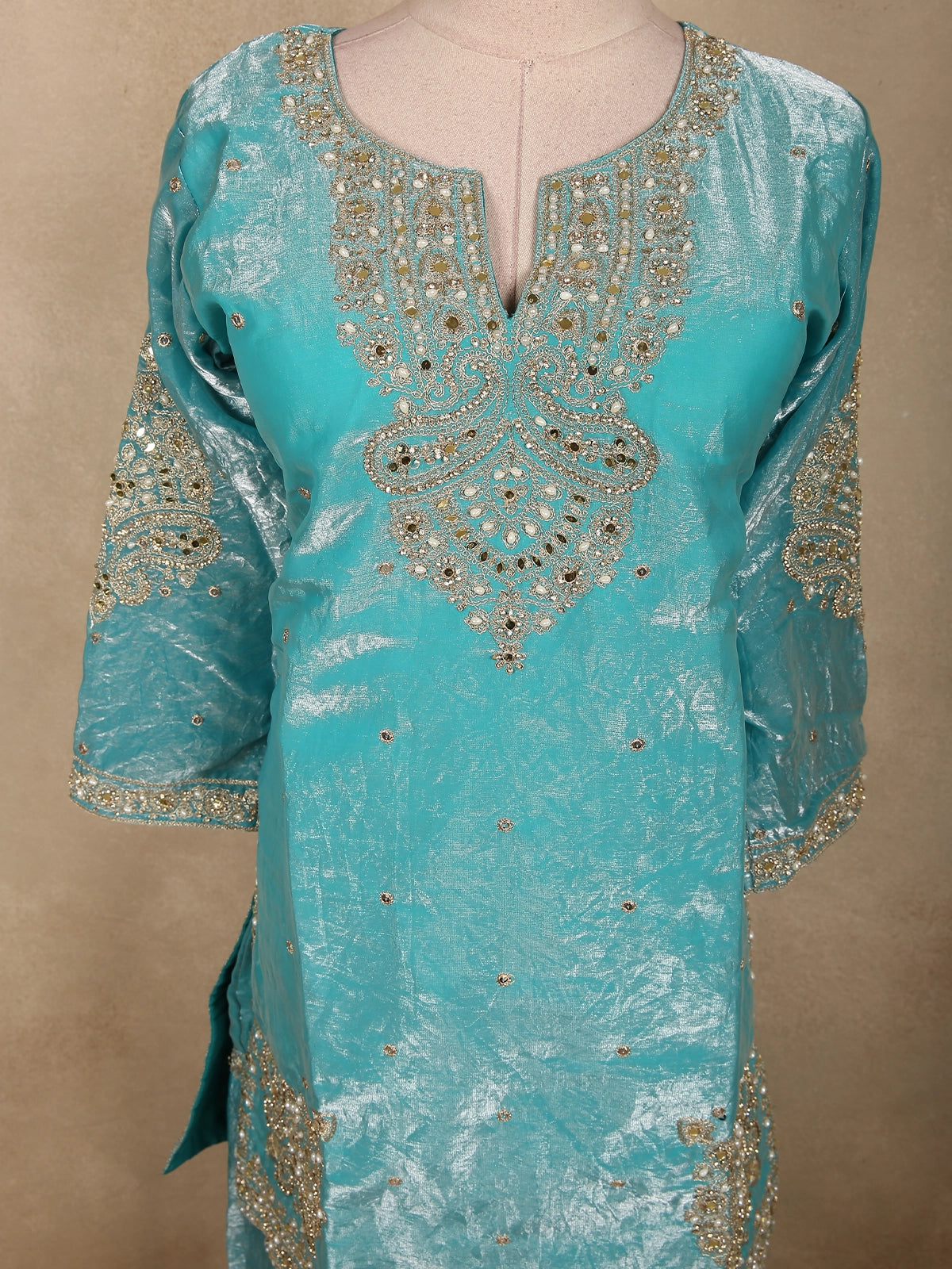 The kurta features intricate beads and zari embroidery along the neckline, sleeves, and hem, creating a refined pattern that highlights traditional craftsmanship with a contemporary touch. Delicate bead accents are scattered across the fabric, adding a soft sparkle that enhances the bright teal tone without overpowering its freshness.