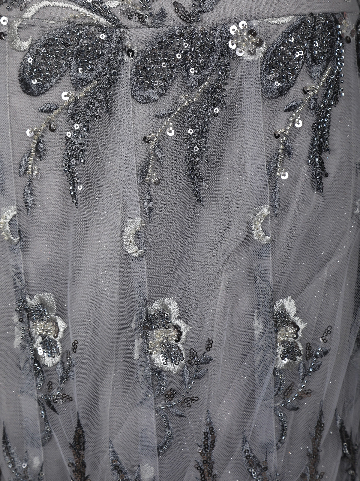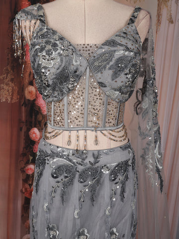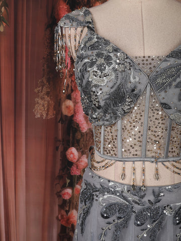 Ash Grey Floral Sequins and Beads Embroidered Design Mermaid Net Lehenga
