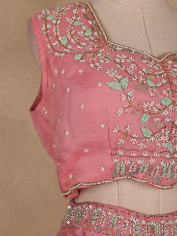 Radiate soft elegance and youthful charm in this Baby Pink Floral Embroidered Design Georgette Skirt Top with Dupatta. Crafted from lightweight georgette, this ensemble captures a dreamy and ethereal essence, perfect for festive gatherings, receptions, or special celebrations. The delicate floral embroidery paired with bead detailing lends a subtle shimmer, adding depth and grace to the pastel hue.