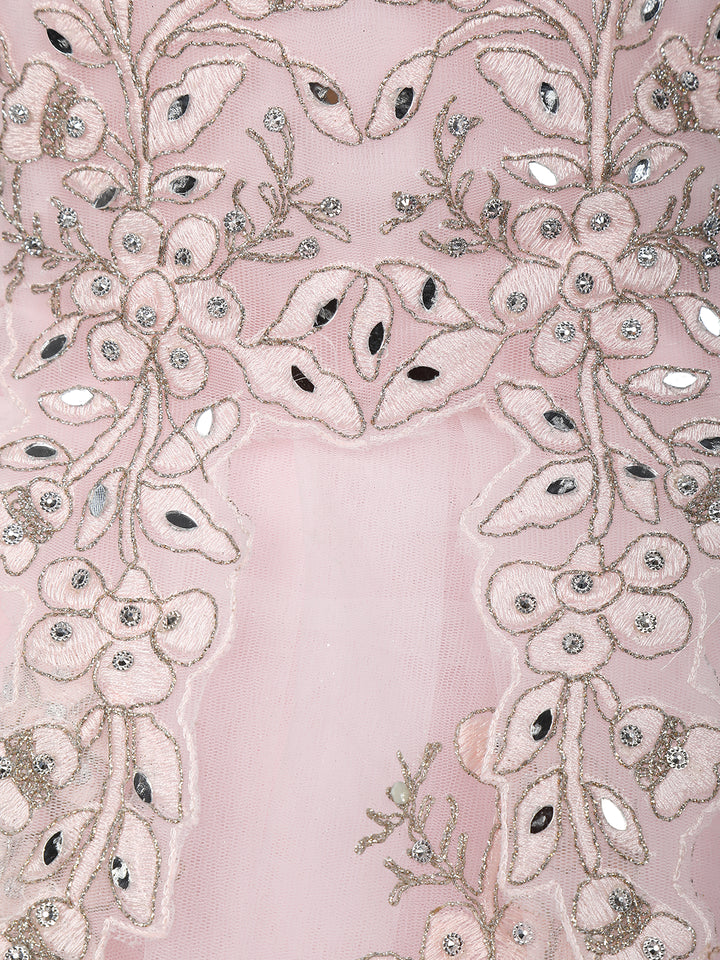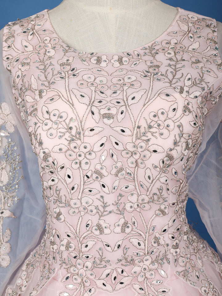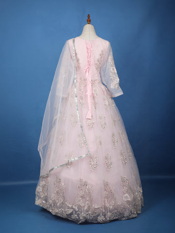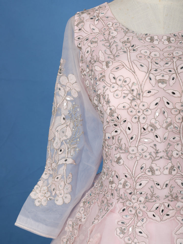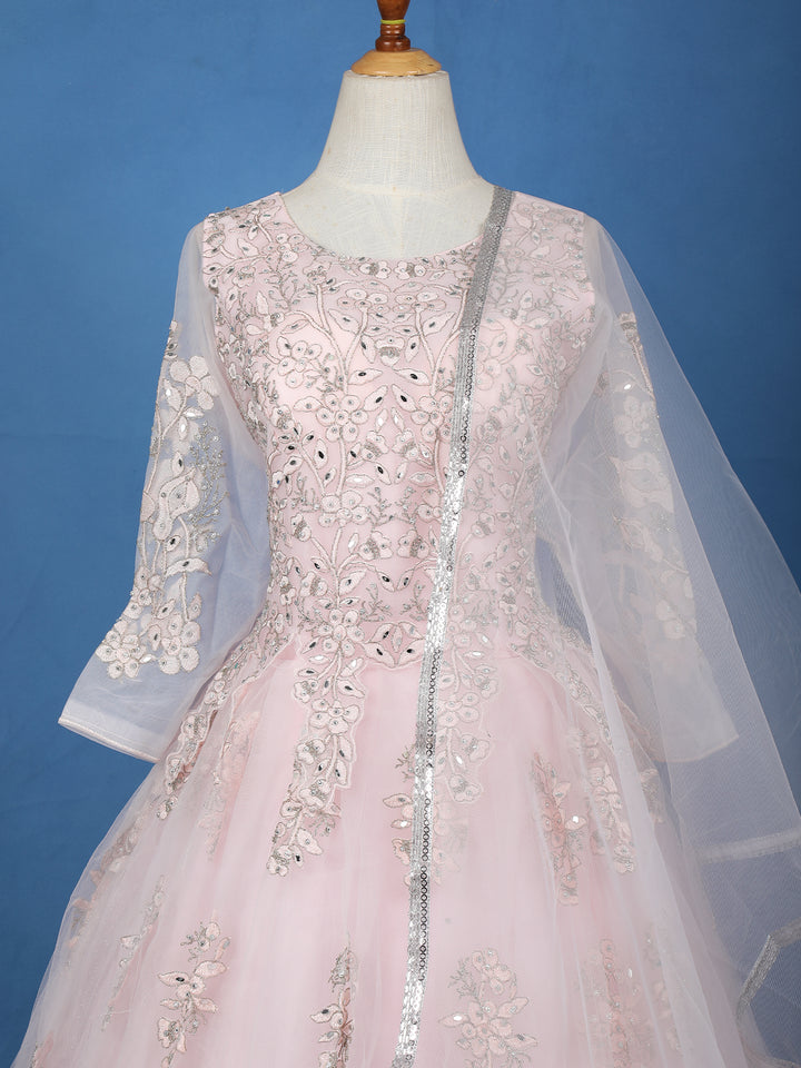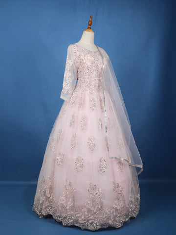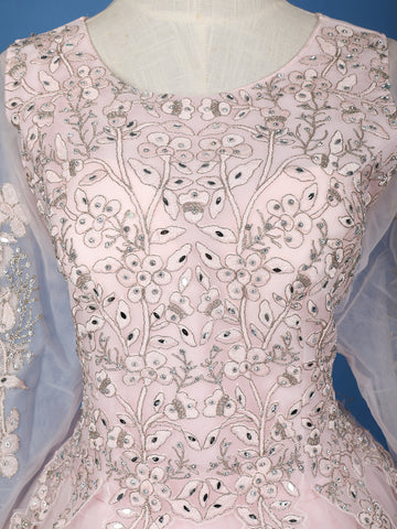 Baby Pink Floral Embroidered Design Net Ball Gown