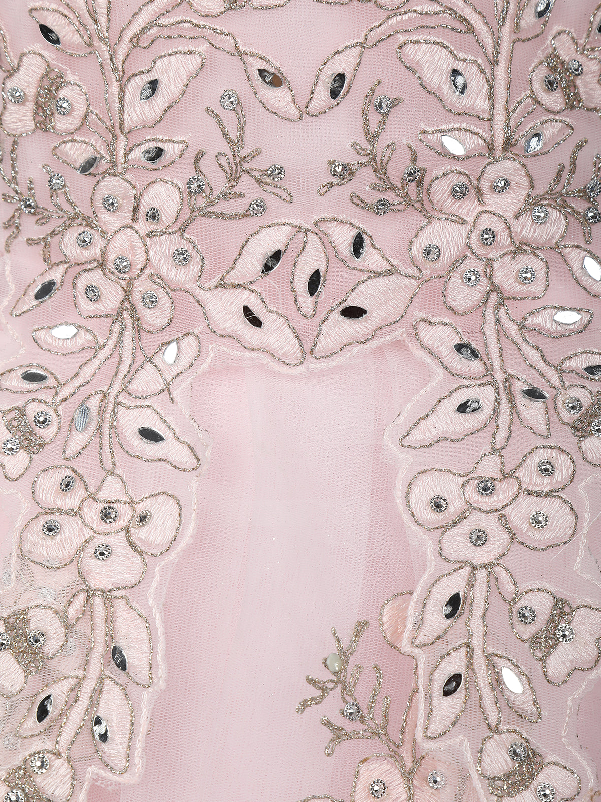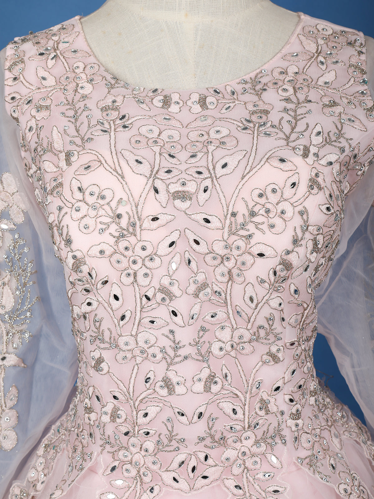 Step into a fairytale of elegance with this Baby Pink Floral Embroidered Net Ball Gown, designed to make you feel like royalty. Crafted from delicate net fabric, the gown features intricate floral embroidery enriched with sequins and mirror work, creating a soft shimmer that captures the light beautifully.