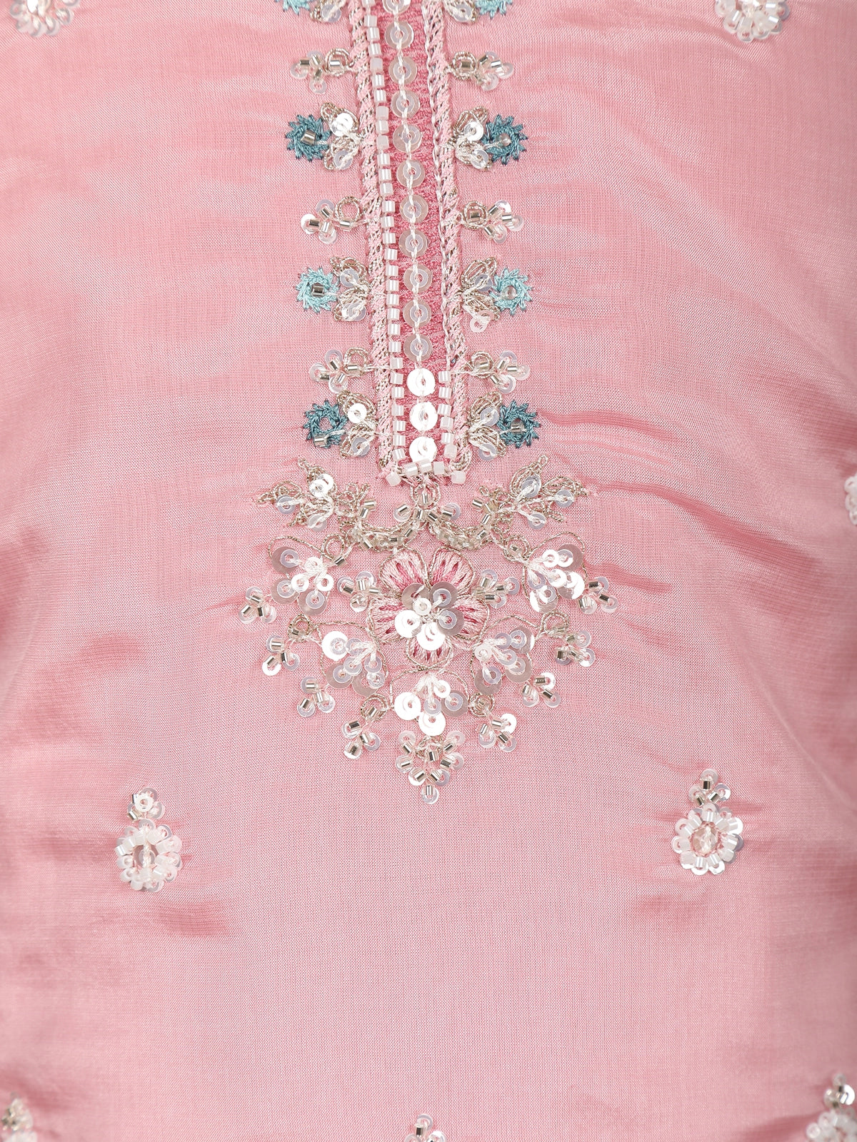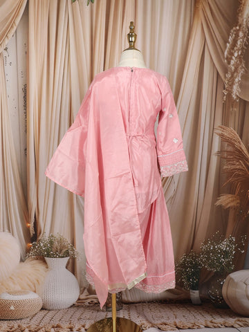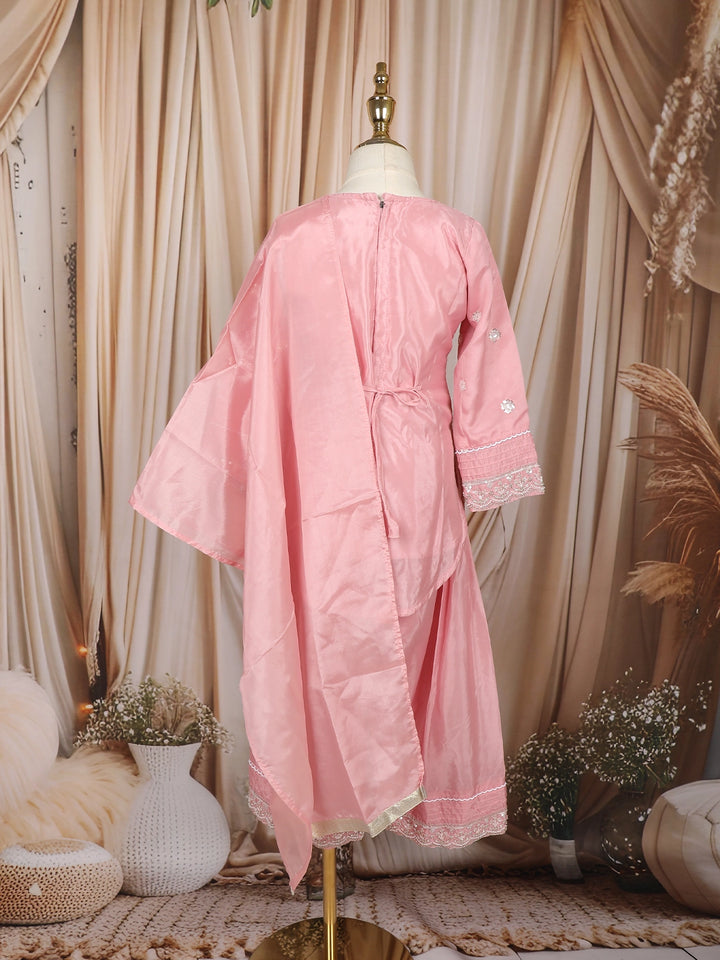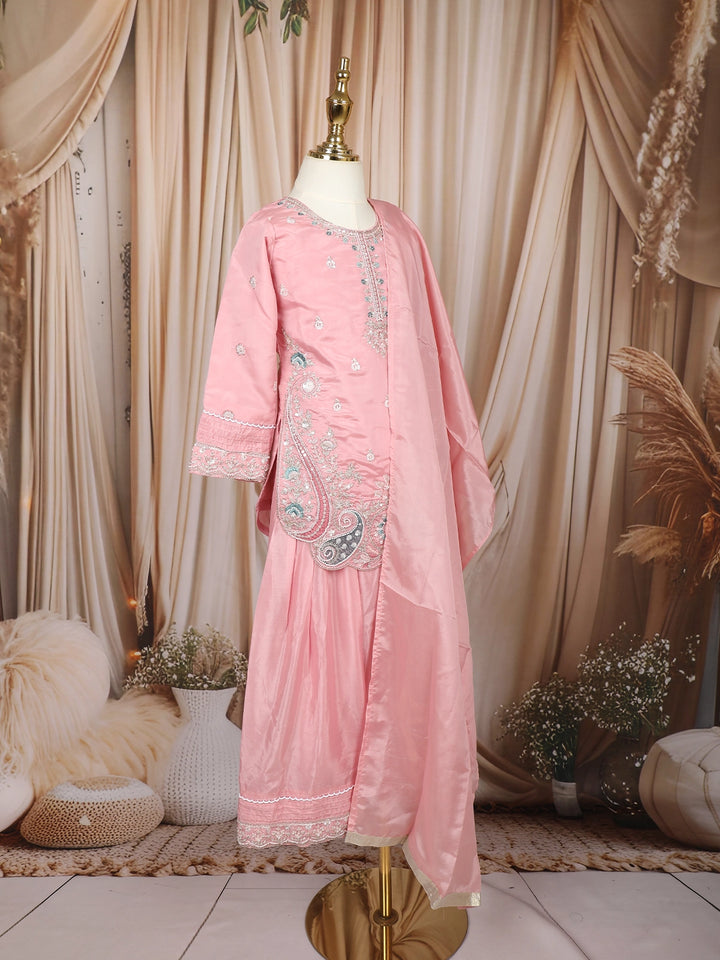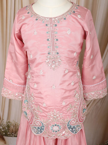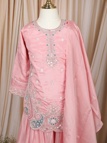 Baby Pink Floral Thread and Sequins Embroidered Design Tissue Silk Kids Palazzo Suit