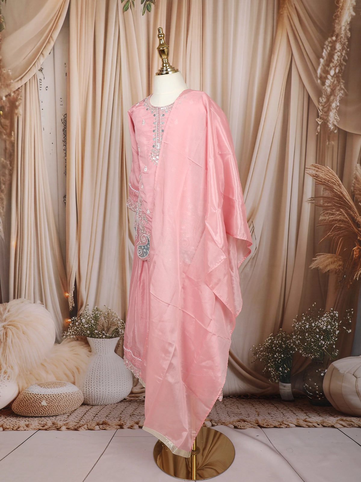 Let your little princess shine in this Baby Pink Floral Thread and Sequins Embroidered Tissue Silk Kids Palazzo Suit, a charming ensemble crafted to bring out effortless elegance at every special occasion. The soft baby pink hue paired with the natural sheen of tissue silk creates a dreamy, graceful look that is perfect for weddings, festive functions, and celebrations. The kurta features delicate floral thread embroidery enhanced with shimmering sequins, adding a subtle sparkle without overwhelming the outfit. The intricately scalloped embroidered hem and beautifully detailed neckline elevate the design with a refined, premium finish. The airy palazzo pants provide both comfort and style, decorated with matching embroidered borders for a cohesive festive flair. Completing the ensemble is a flowing dupatta in the same soothing shade, adding the perfect finishing touch. This outfit is thoughtfully designed to offer elegance, comfort, and sophistication—making it an ideal choice for your child’s ethnic wardrobe.