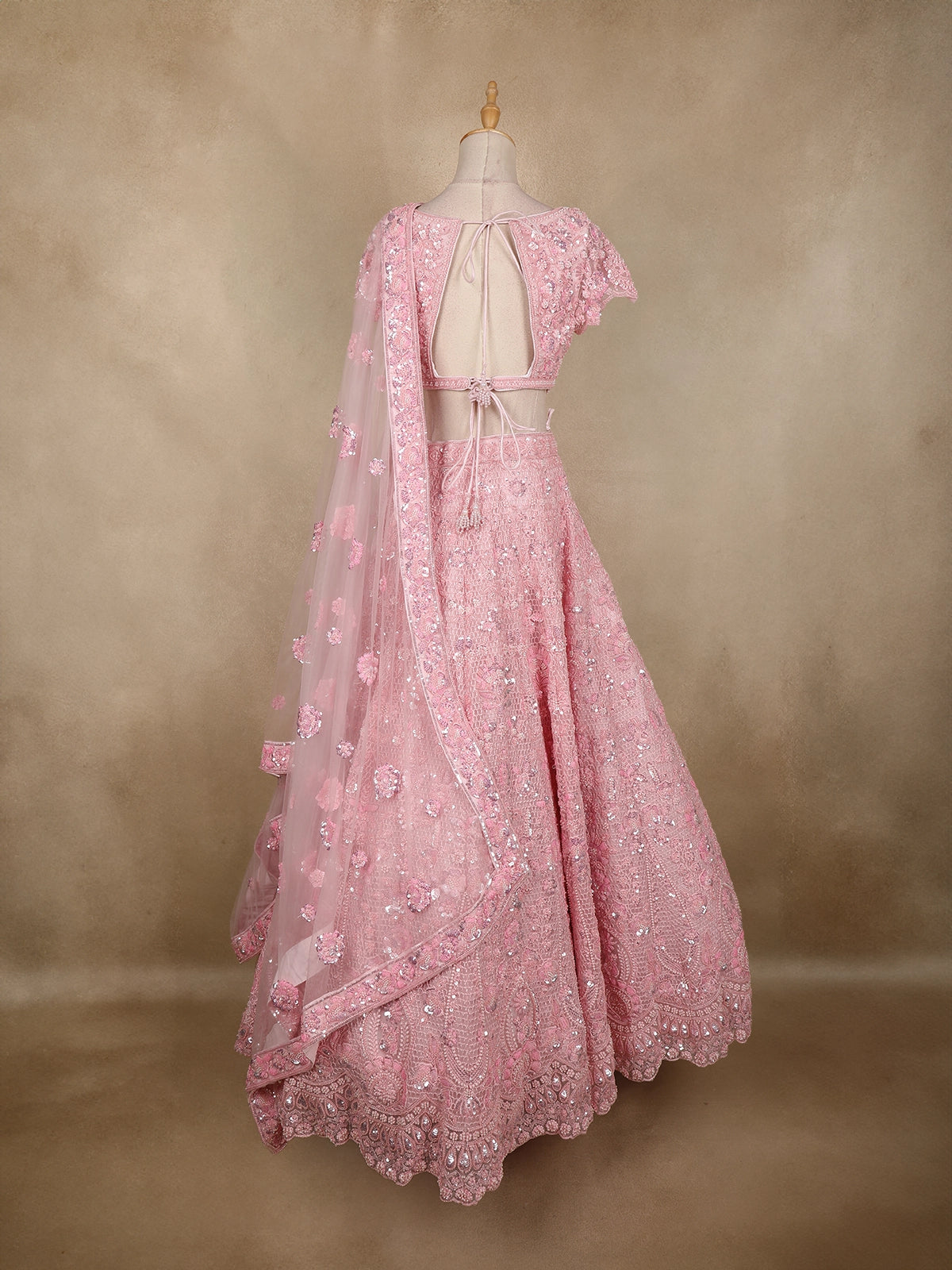 This exquisite lehenga, drenched in a soft baby pink hue, is perfect for wedding receptions, engagement parties, sangeet nights, or festive soirées, exuding feminine grace with every twirl.