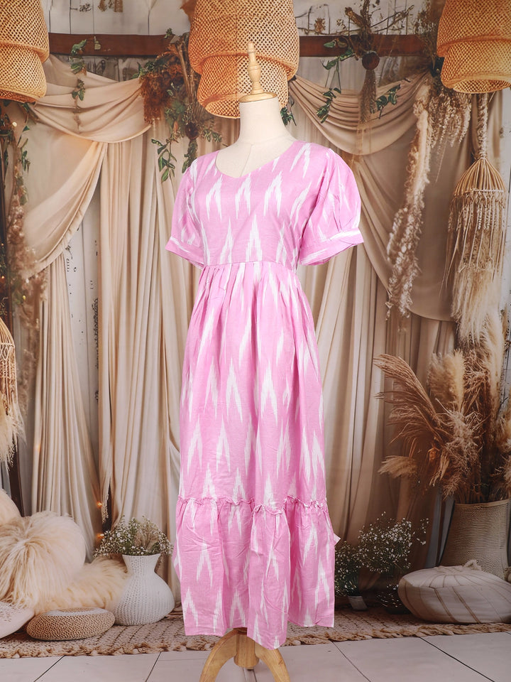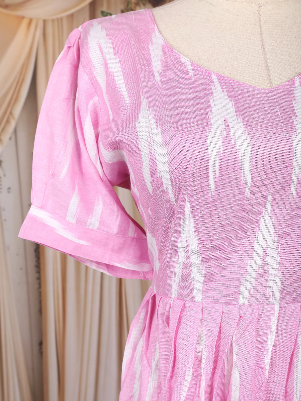 The design features a fit-and-flare silhouette with a gathered waistline that adds gentle volume and flow. The all-over Ikat weave pattern in soft pink and ivory tones brings a serene and refreshing vibe. The round neckline paired with puffed half sleeves and turned-up cuffs lends a youthful, contemporary edge. A subtle tiered detailing near the hemline adds texture and movement, making this kurti an ideal choice for casual days, work wear, or relaxed weekend outings.