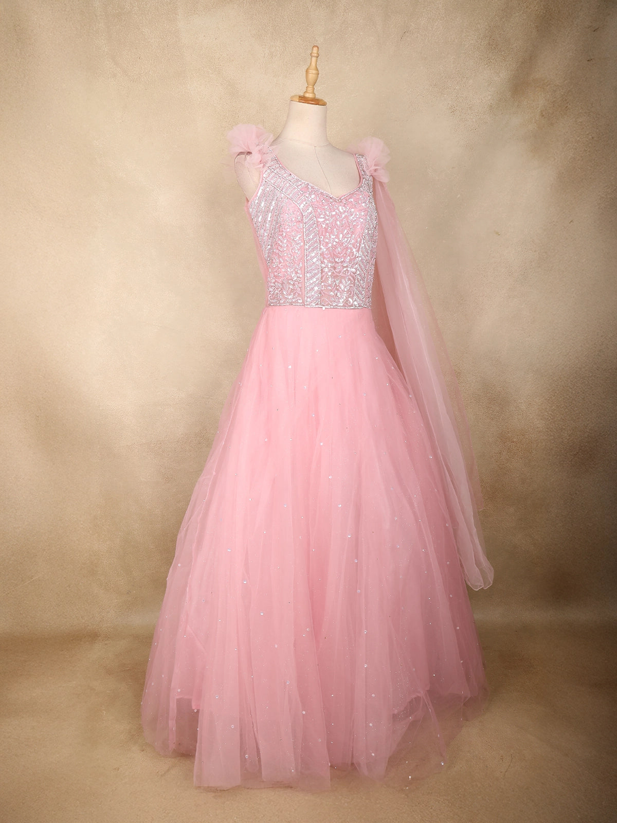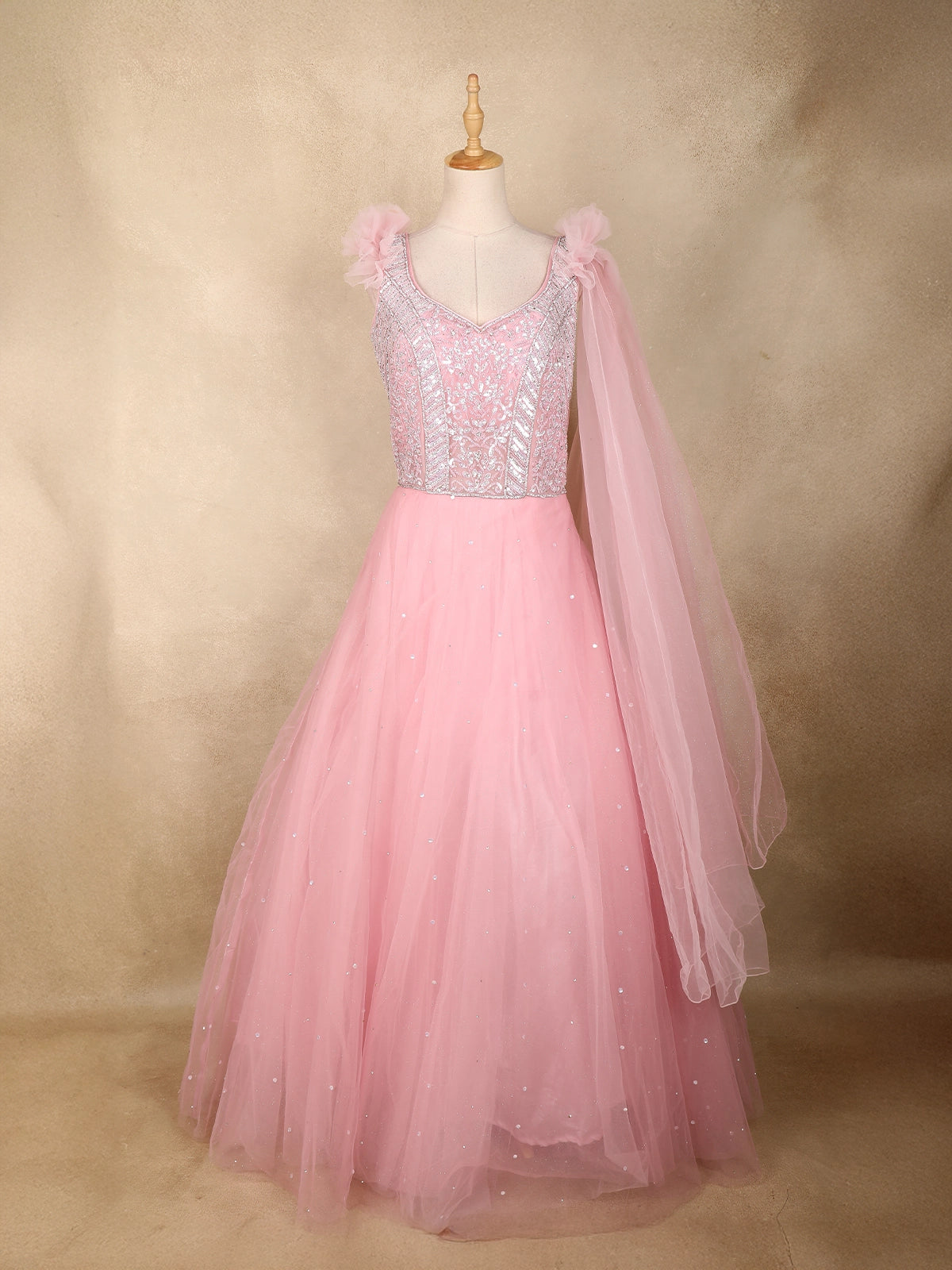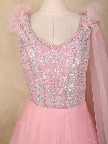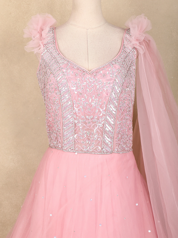 Baby Pink Sequin Embroidered Net Gown with One-Shoulder Dupatta