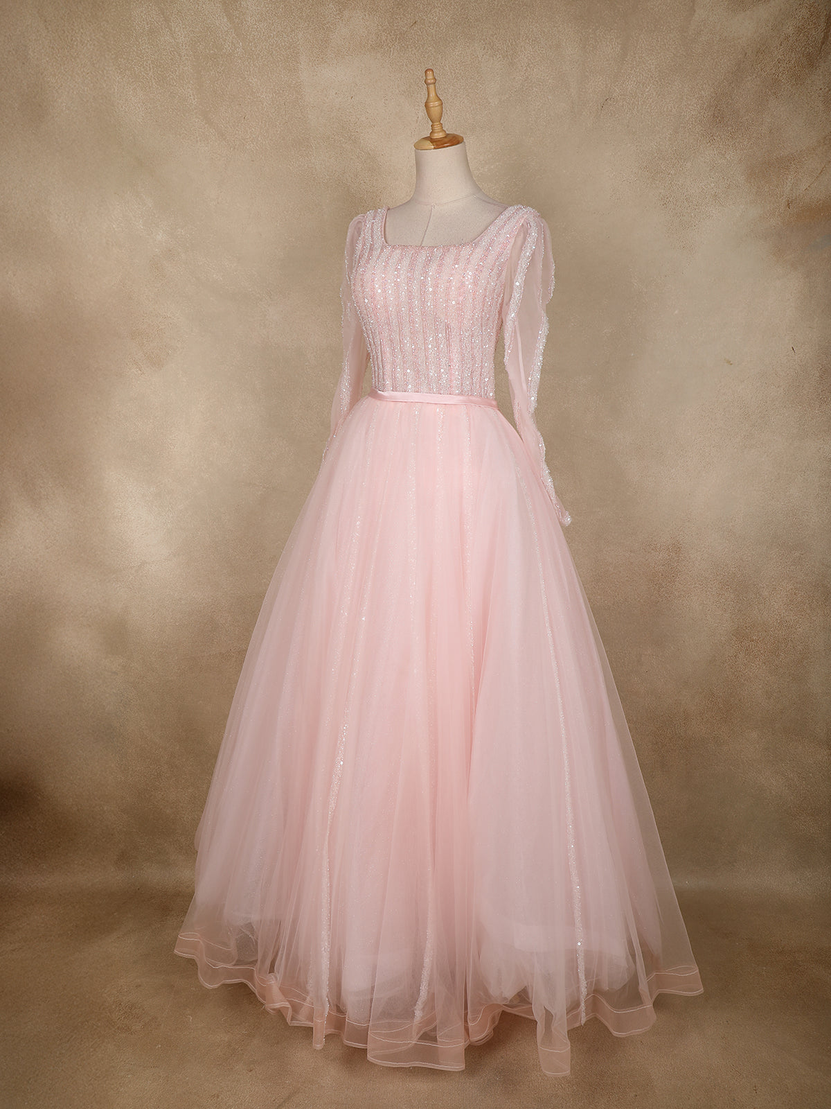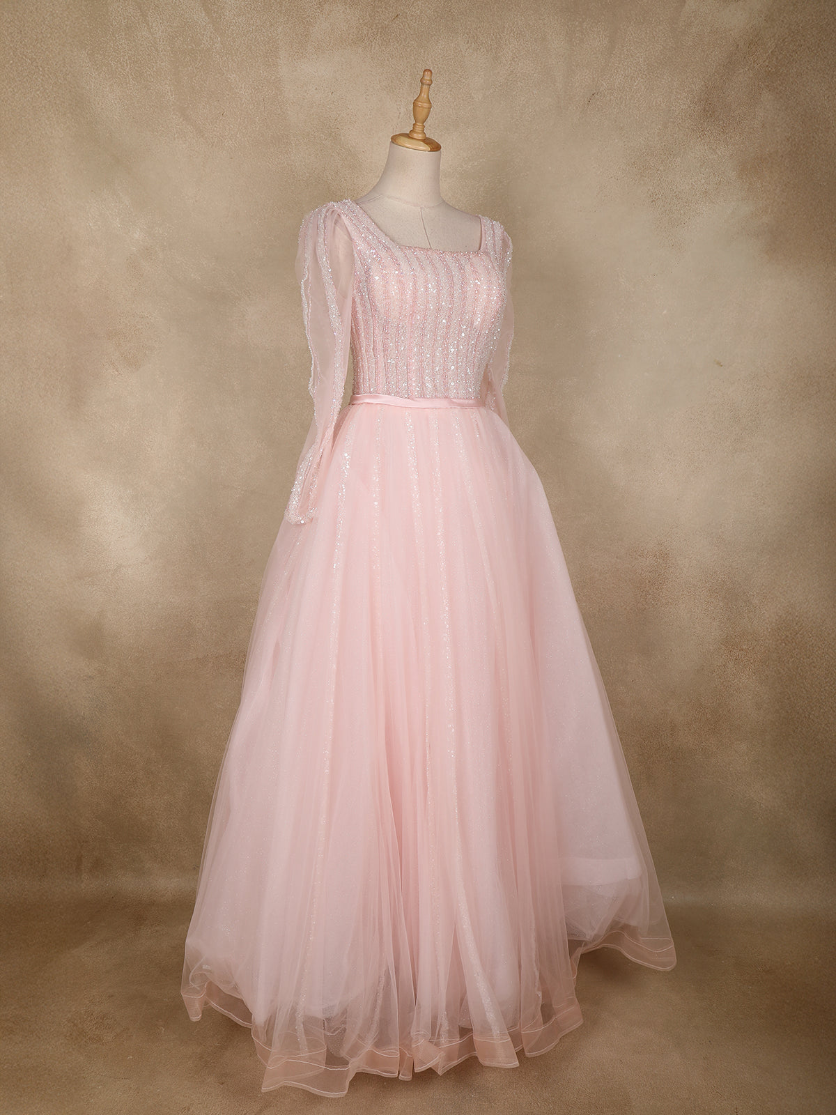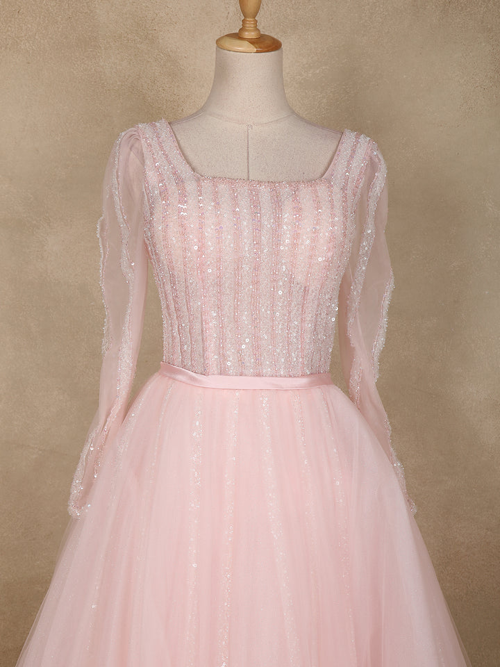 Embrace timeless elegance with this Baby Pink Net Gown, beautifully adorned with shimmering sequins and delicate beadwork. Designed to deliver a dreamy princess-like charm, the fitted bodice features vertical sequin detailing that elongates the silhouette, while the sheer full sleeves add a graceful and modern touch.