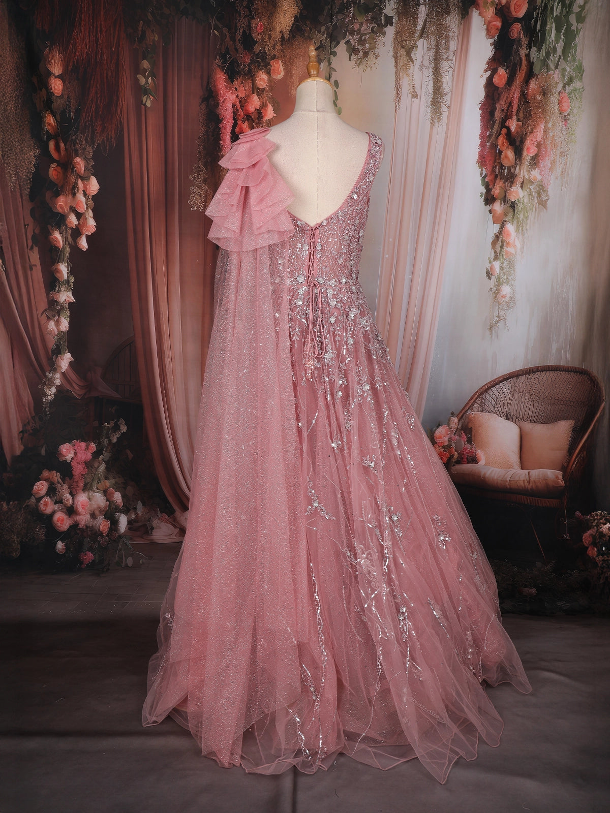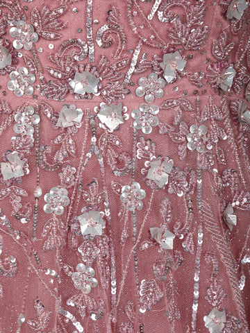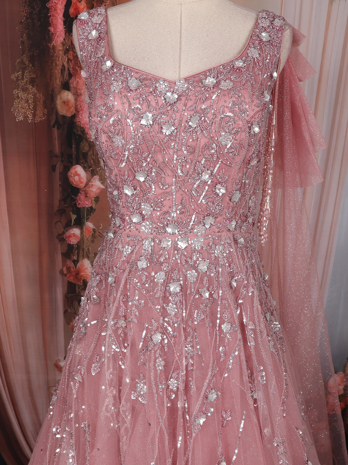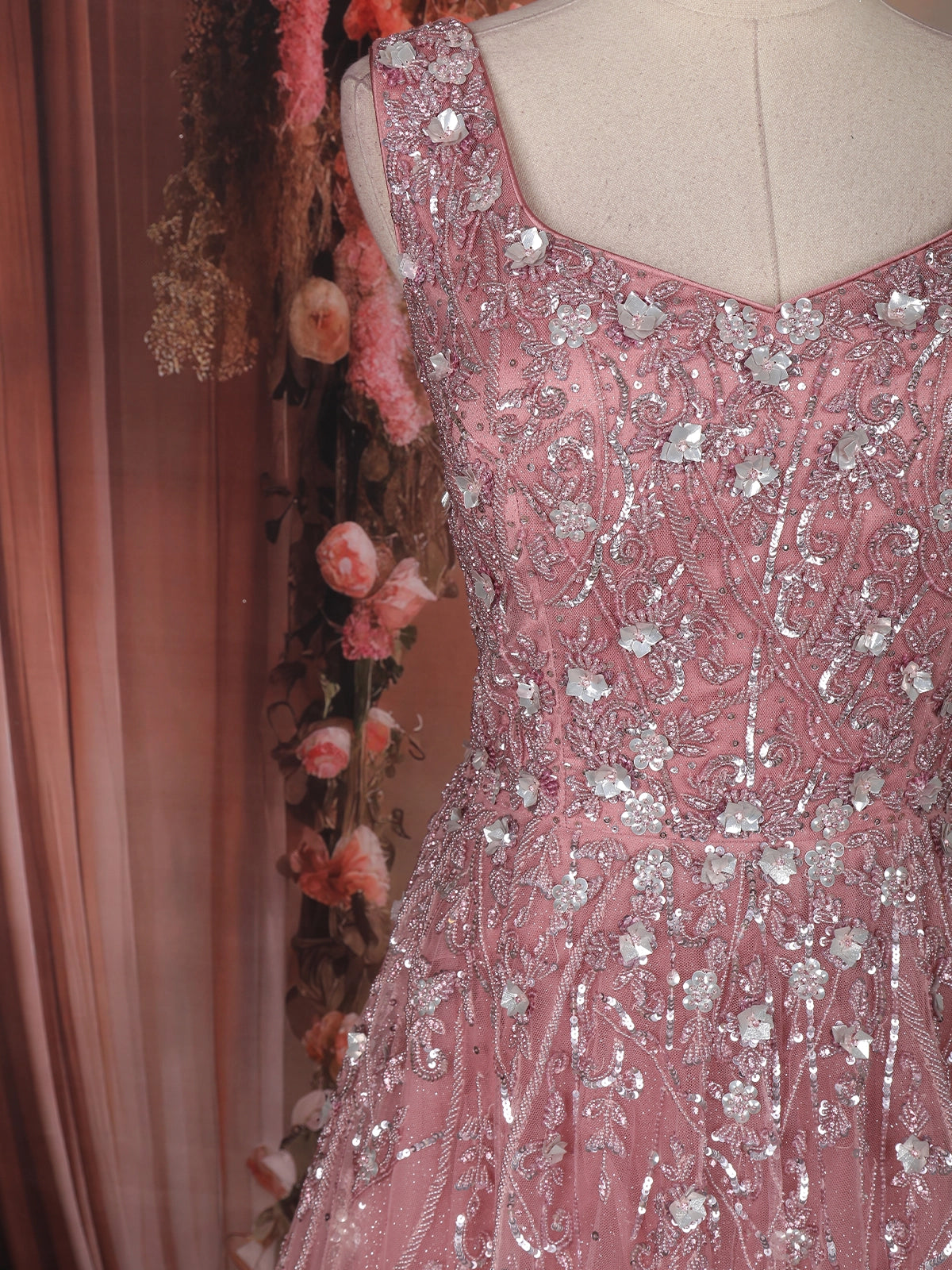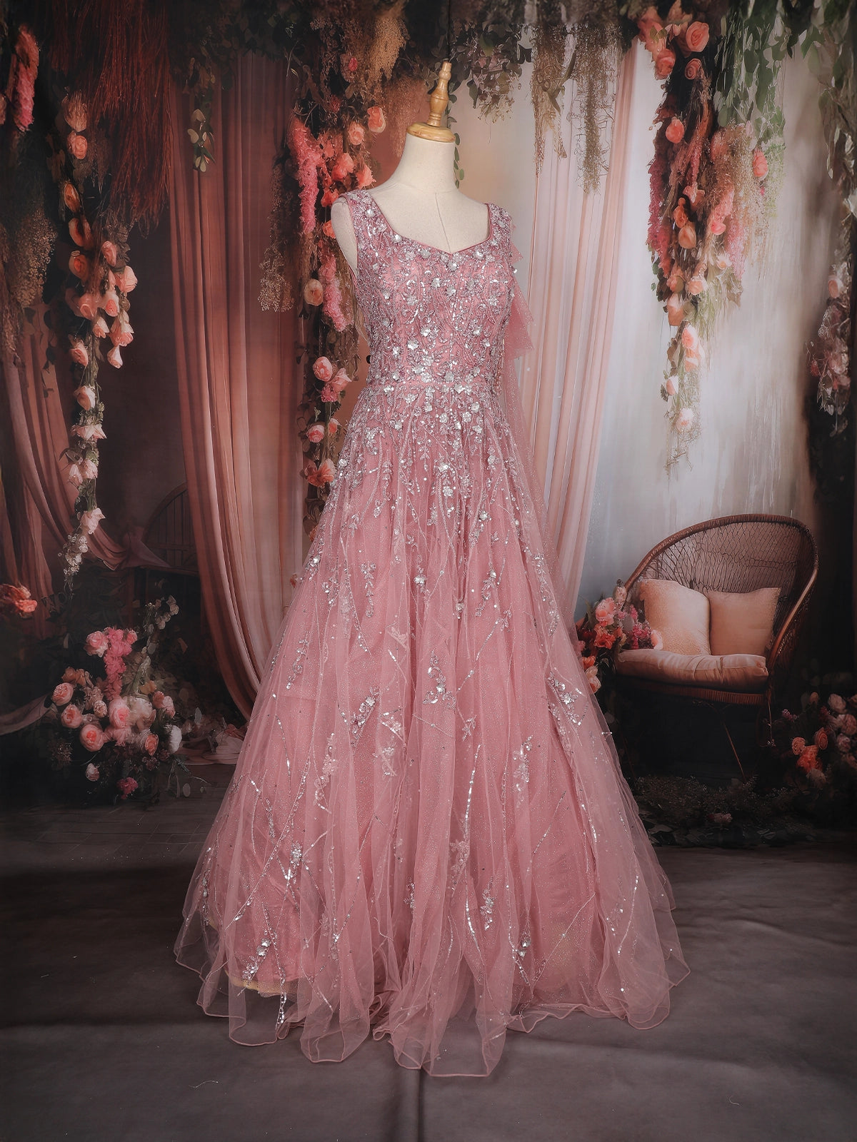 Step into the spotlight with this breathtaking Baby Pink Net Ball Gown, beautifully crafted to bring out your fairytale elegance. Designed with a glamorous sleeveless bodice fully adorned in sparkling sequins and bead work, this gown creates a radiant shimmer effect from every angle.