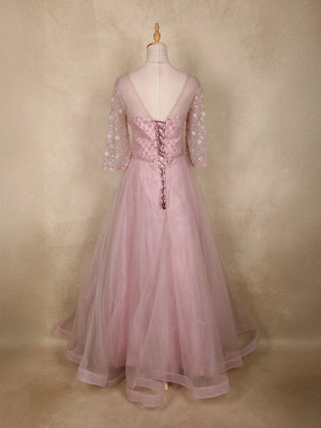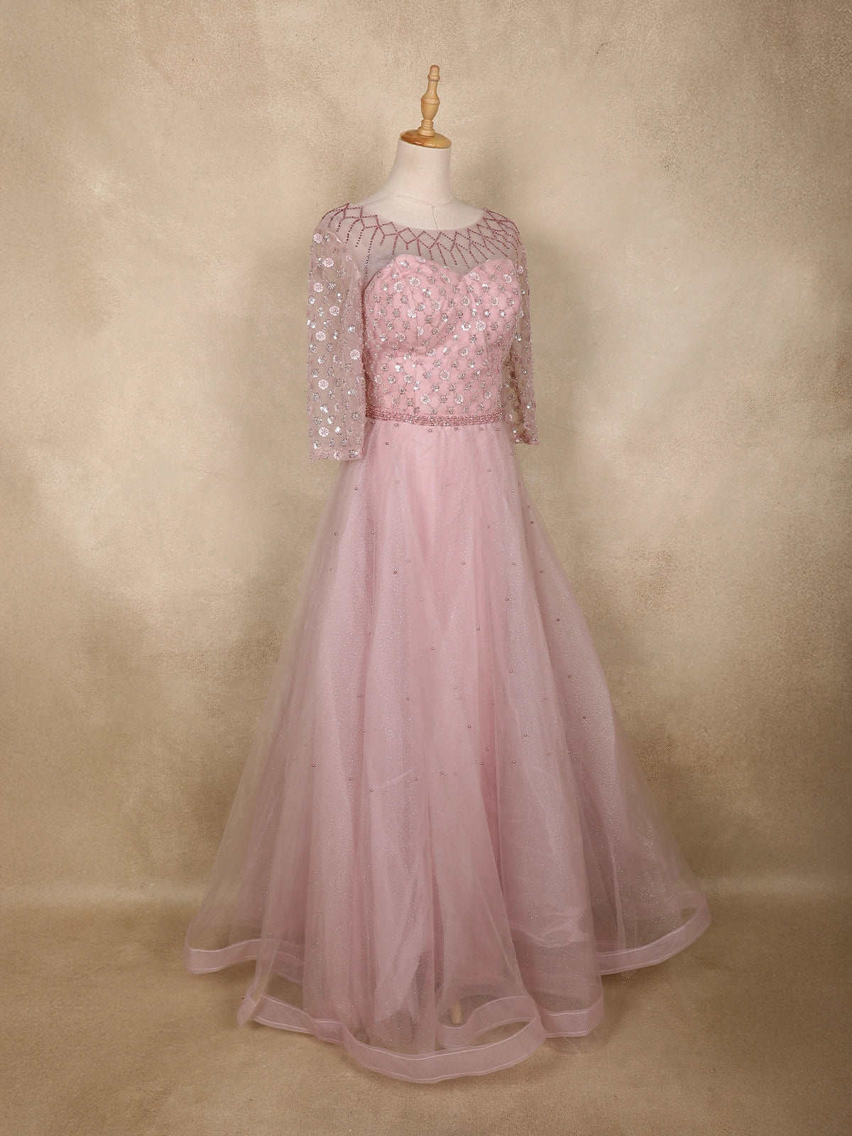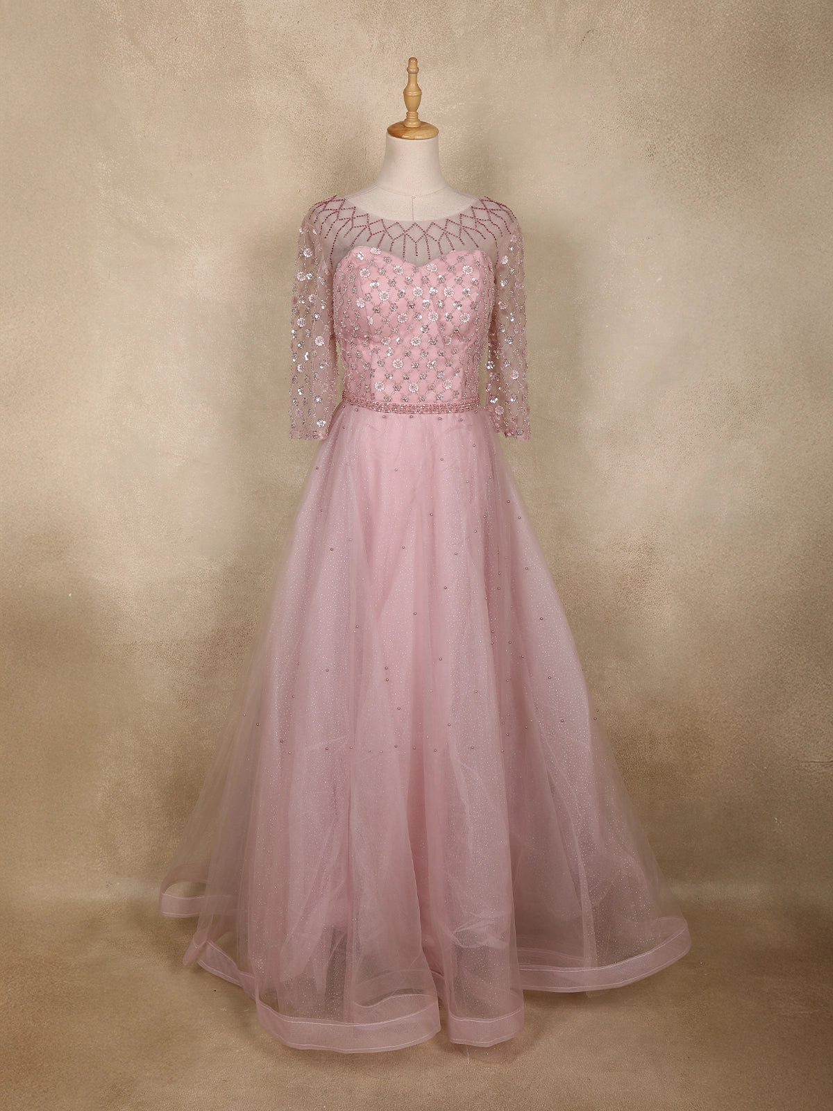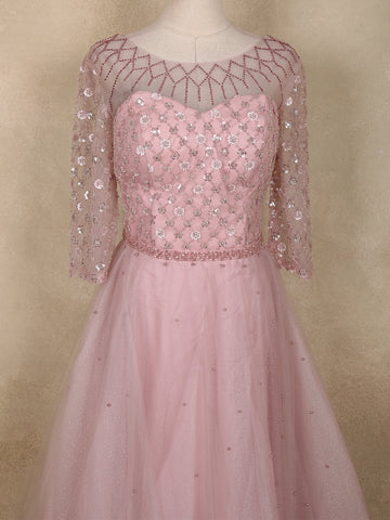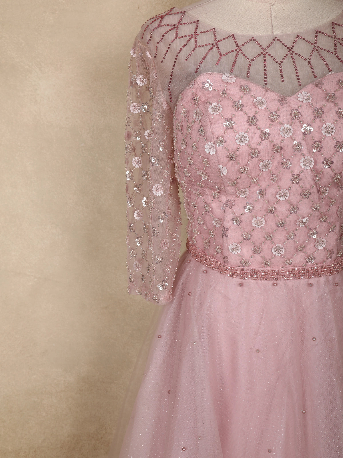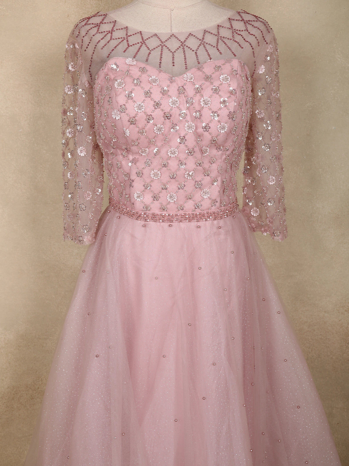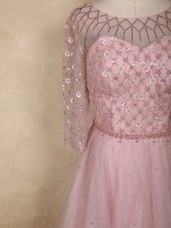 Step into a world of fairytale elegance with this dreamy baby pink net gown, crafted to make you shine at every special occasion. The gown features a sweetheart neckline layered with a delicately embroidered illusion yoke, adding a hint of modest charm while enhancing the neckline beautifully. The semi-sheer sleeves are adorned with floral sequin motifs that add a touch of sparkle with every movement.