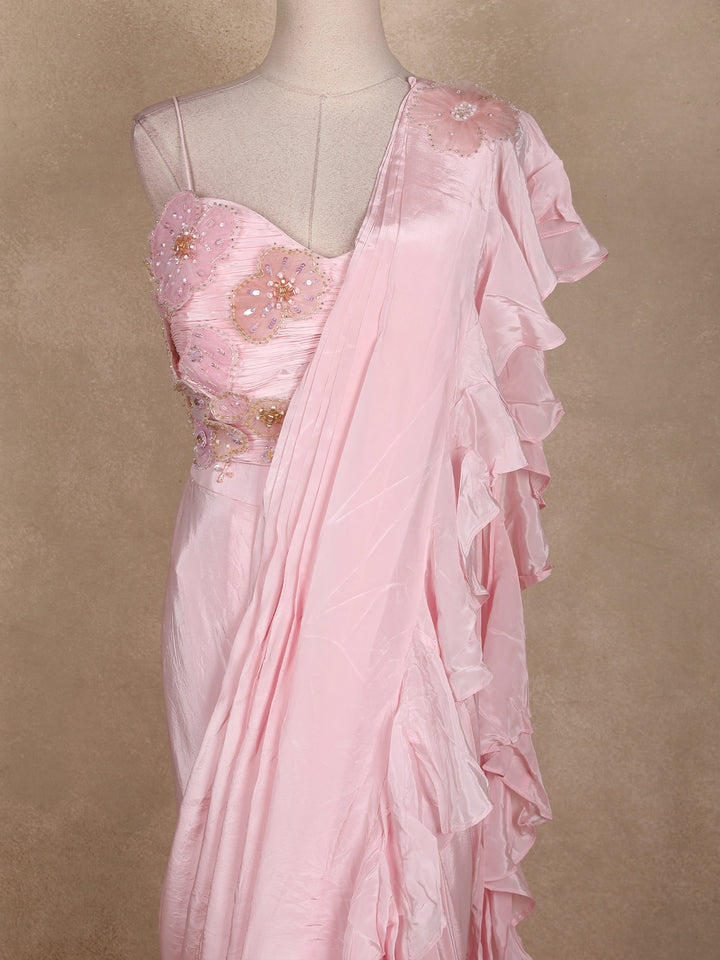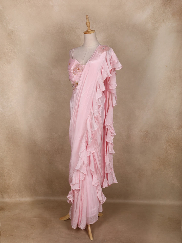 Baby Pink Solid Design Satin Ready To Wear Ruffle Saree