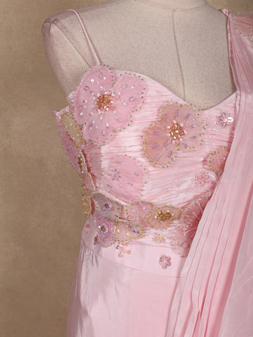 The accompanying satin blouse adds a touch of sparkle with delicate sequin and bead embroidery across the bodice, creating a soft shimmer that complements the light pink tone. The sweetheart neckline and spaghetti straps infuse a youthful and contemporary charm into this elegant piece.