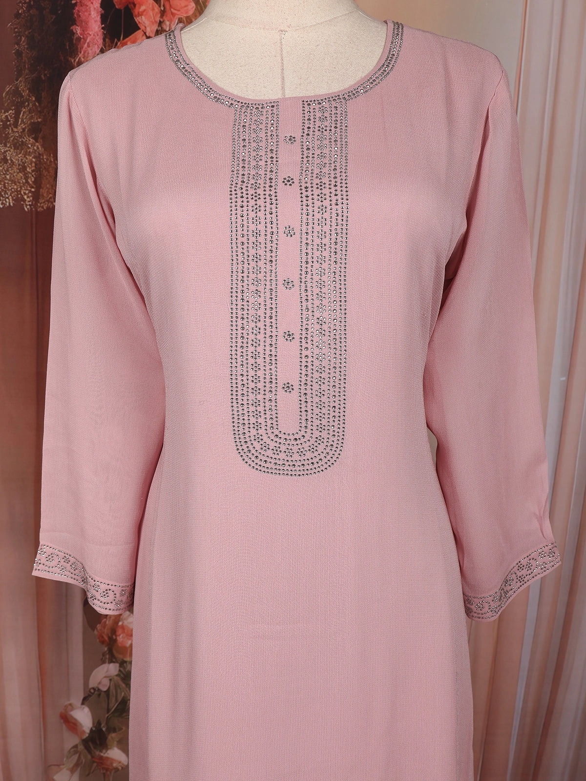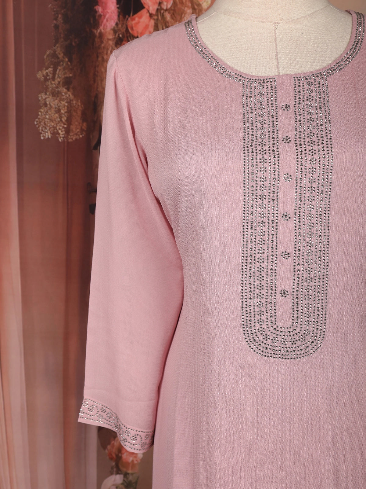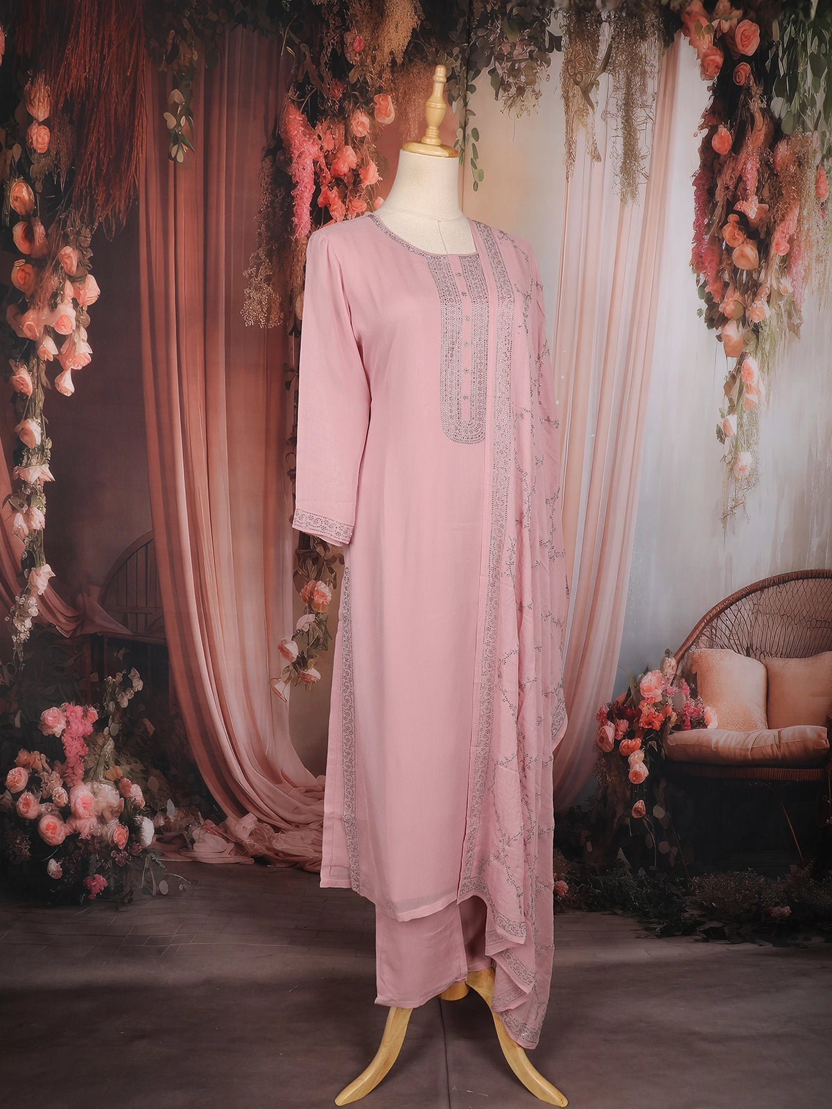 The matching chiffon dupatta is enhanced with all-over stone embellishments and a refined border, lending a festive charm without overwhelming the look. Paired with coordinated straight pants, this ensemble creates a polished and timeless appearance—perfect for celebrations, day events, and elegant gatherings.