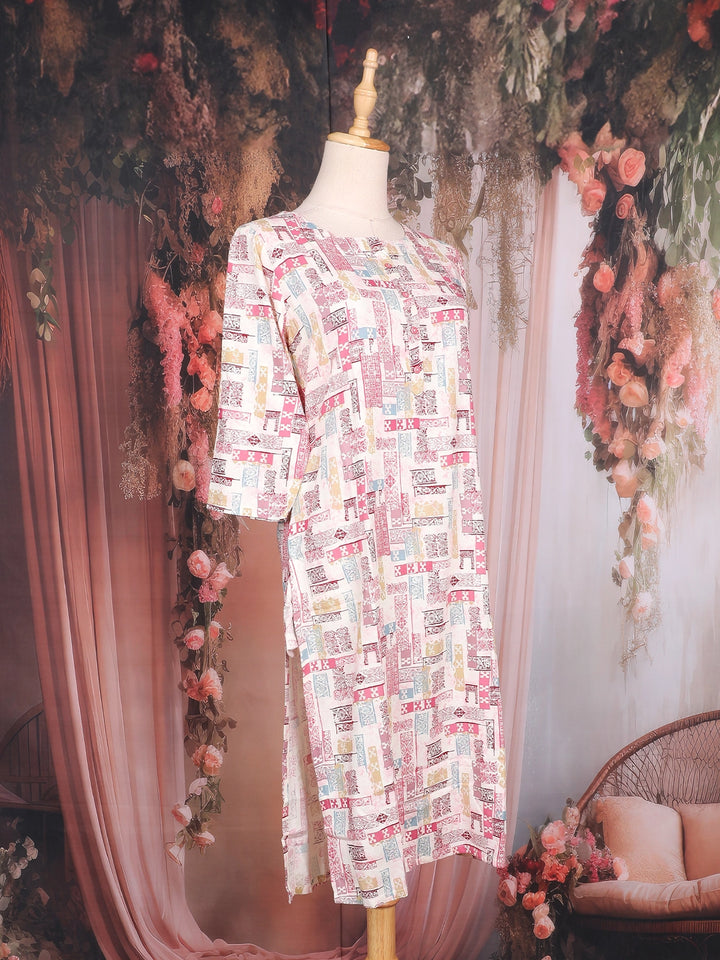 Fuse comfort with contemporary charm in this Beige Abstract Printed Cotton Rayon Kurti, an effortlessly chic piece tailored for the modern woman who appreciates tradition with a twist. Crafted from a soft and breathable cotton-rayon fabric, this kurti promises ease of wear through long hours, whether you're attending meetings or stepping out for a casual day.