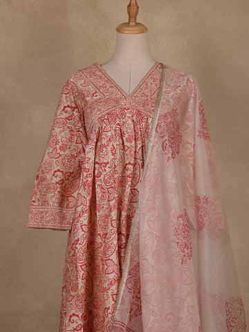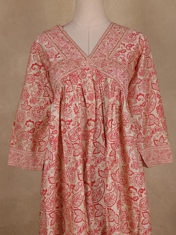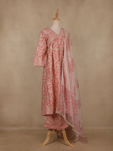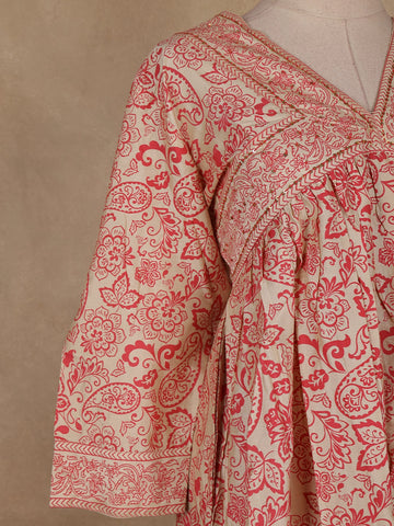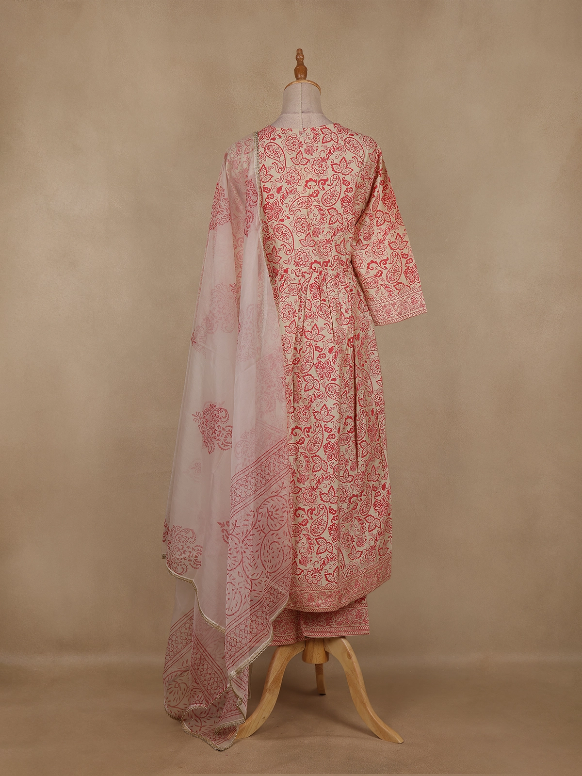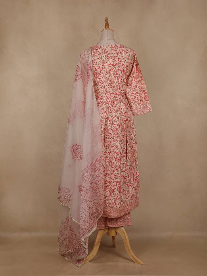 Embrace the artistry of traditional Indian prints with this Beige and Red Floral Block Printed Cotton Anarkali Suit, a perfect blend of elegance, comfort, and timeless charm. Crafted from premium quality cotton, the ensemble features intricate floral and paisley block prints in vibrant red against a serene beige backdrop — a pairing that radiates understated grace.