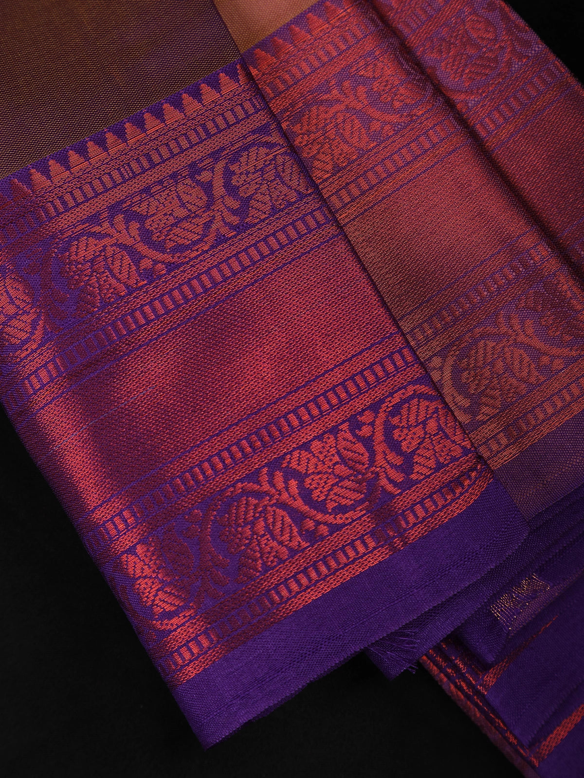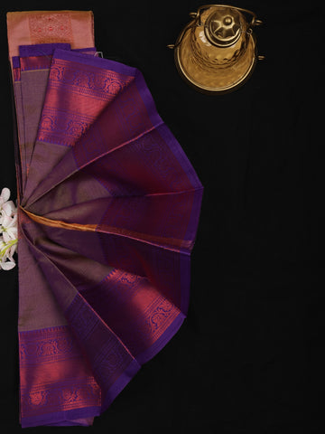 Adding a striking contrast, the saree is finished with a rich purple zari border, intricately woven with traditional patterns that enhance its regal look. The zari detailing introduces depth and grandeur, making the saree stand out while maintaining its graceful balance. The coordinated pallu complements the border, completing the ensemble with classic craftsmanship.