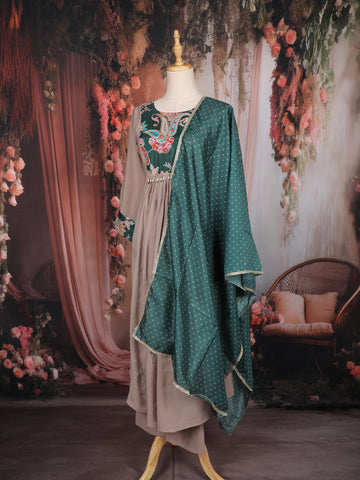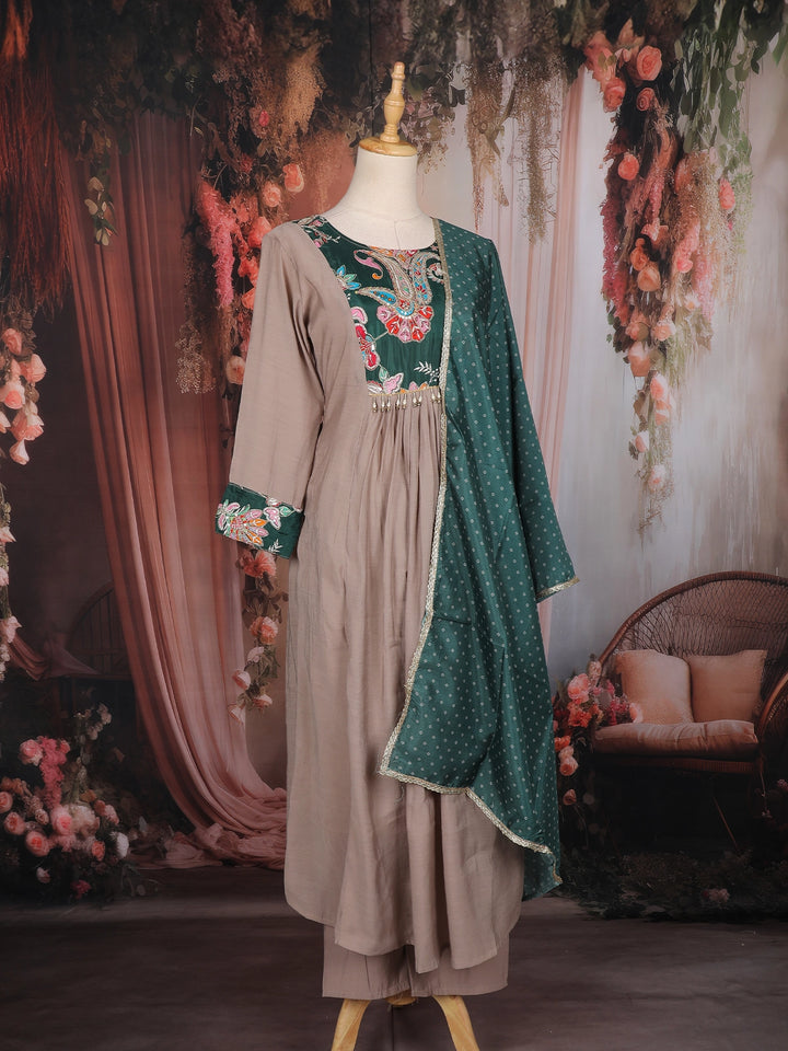 Beige Floral Embroidered Design Cotton Anarkali Salwar Suit with Printed Dupatta