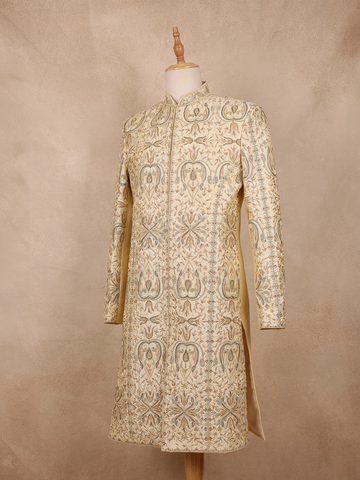 Beige Floral Embroidered Raw Silk Sherwani Suit