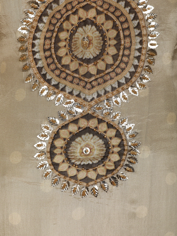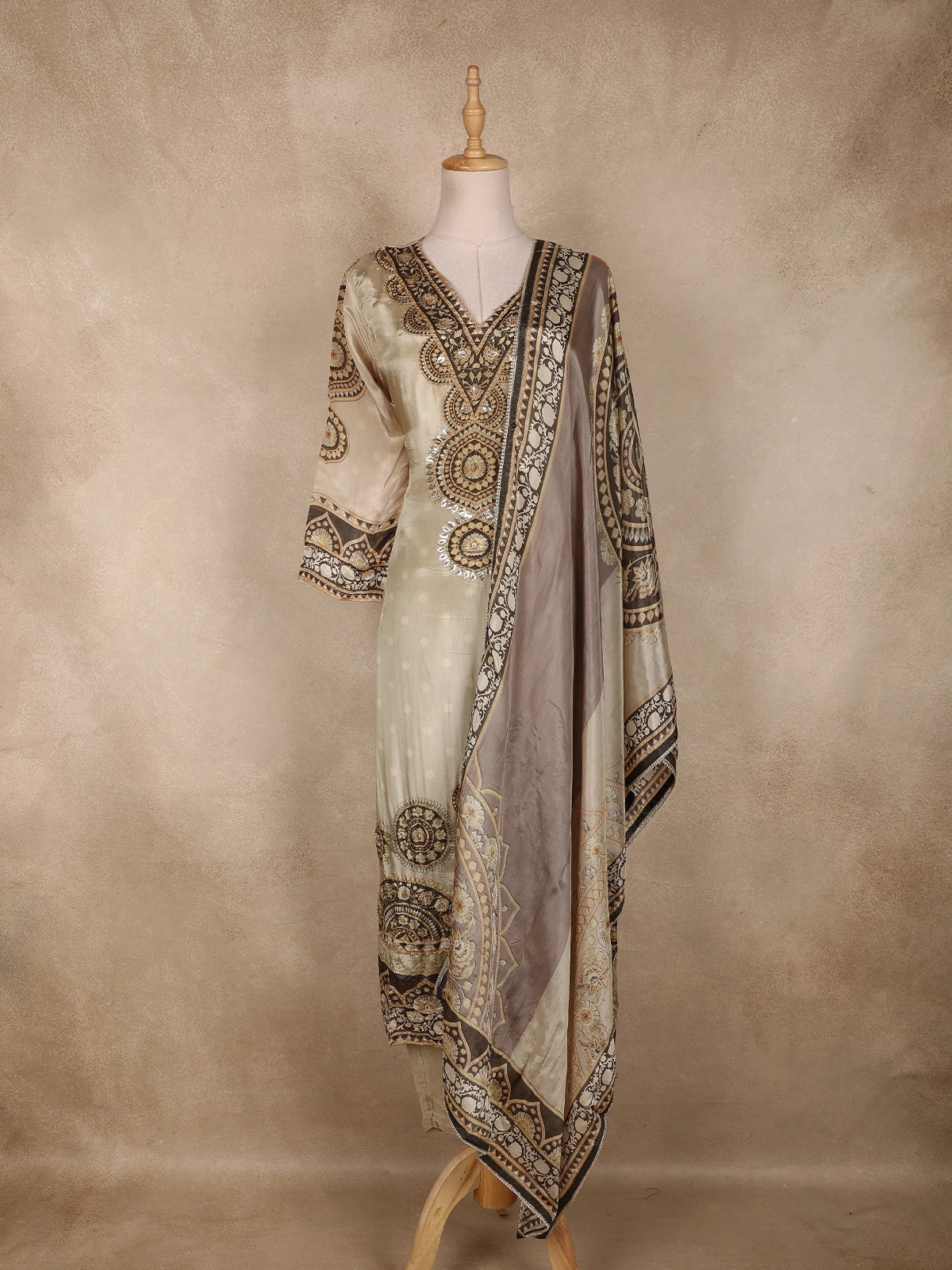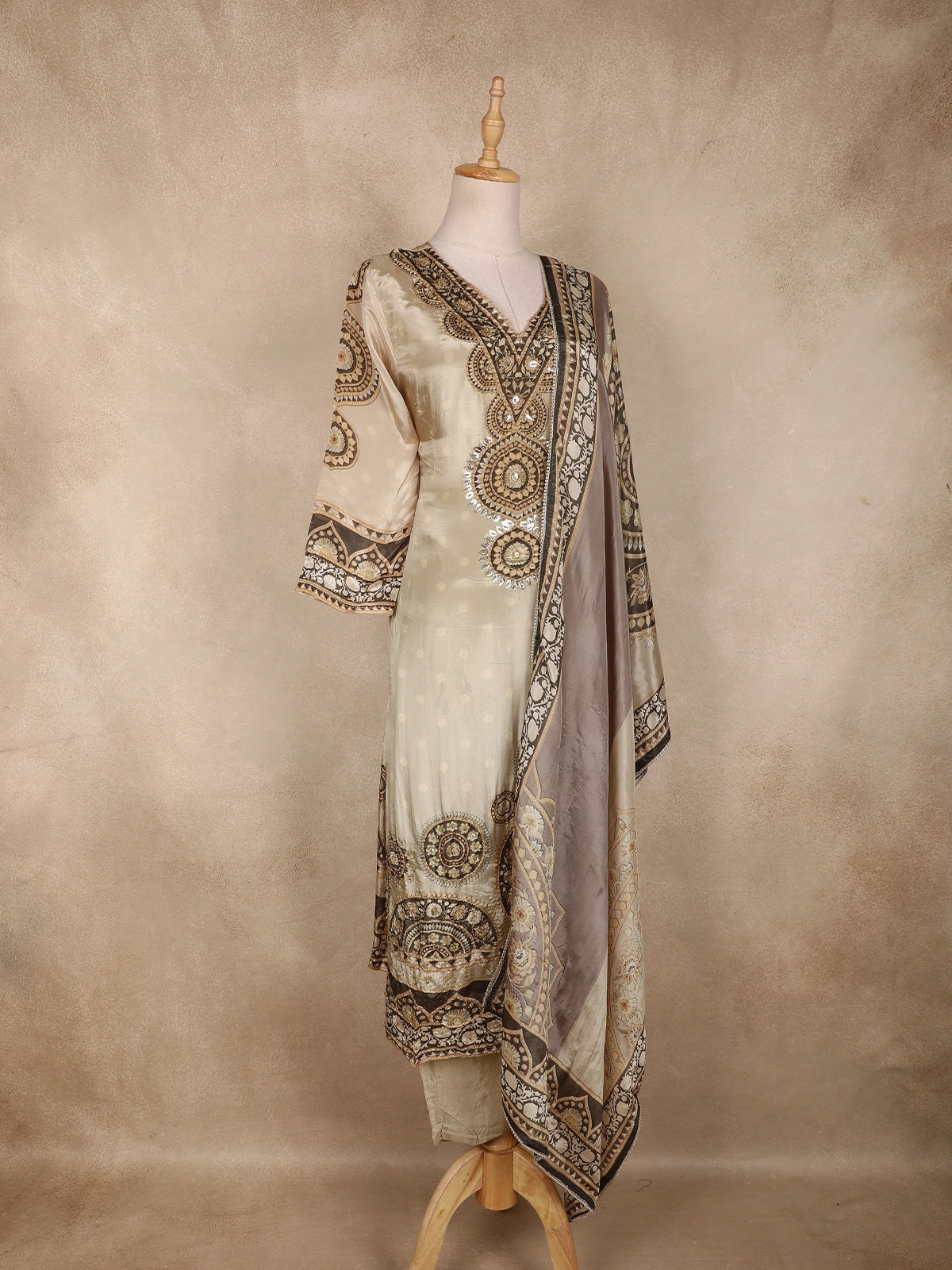 Perfect for festive gatherings, office ethnic wear, family functions, temple visits, and daytime celebrations, this beige crepe salwar suit pairs effortlessly with minimal jewellery and neutral-toned footwear.