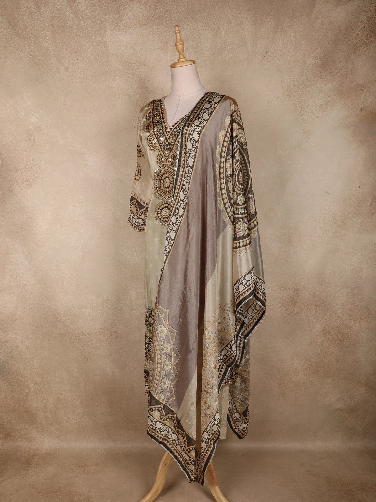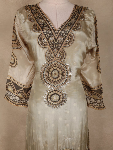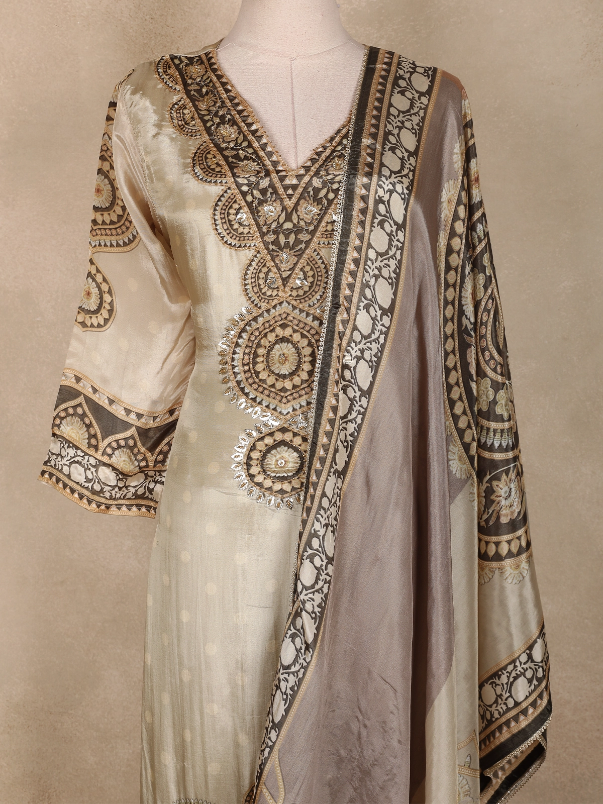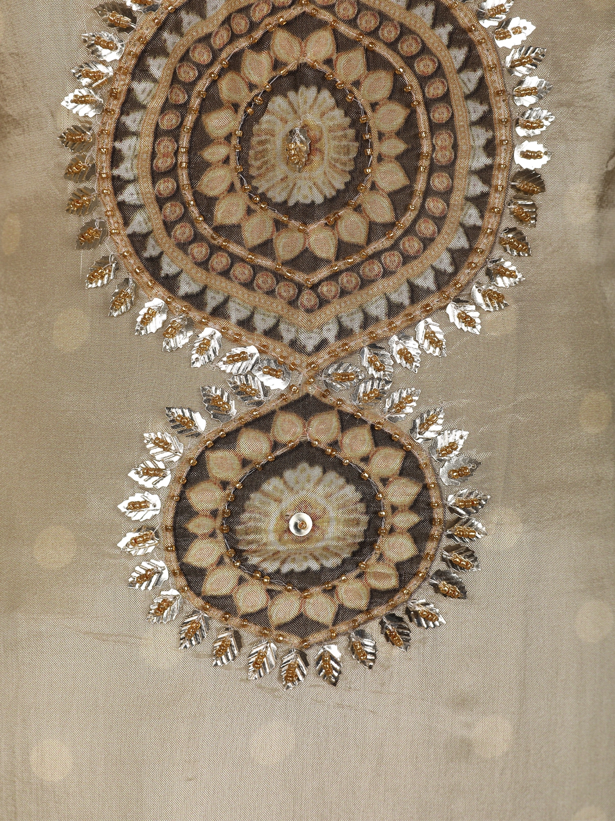 Perfect for festive gatherings, office ethnic wear, family functions, temple visits, and daytime celebrations, this beige crepe salwar suit pairs effortlessly with minimal jewellery and neutral-toned footwear.