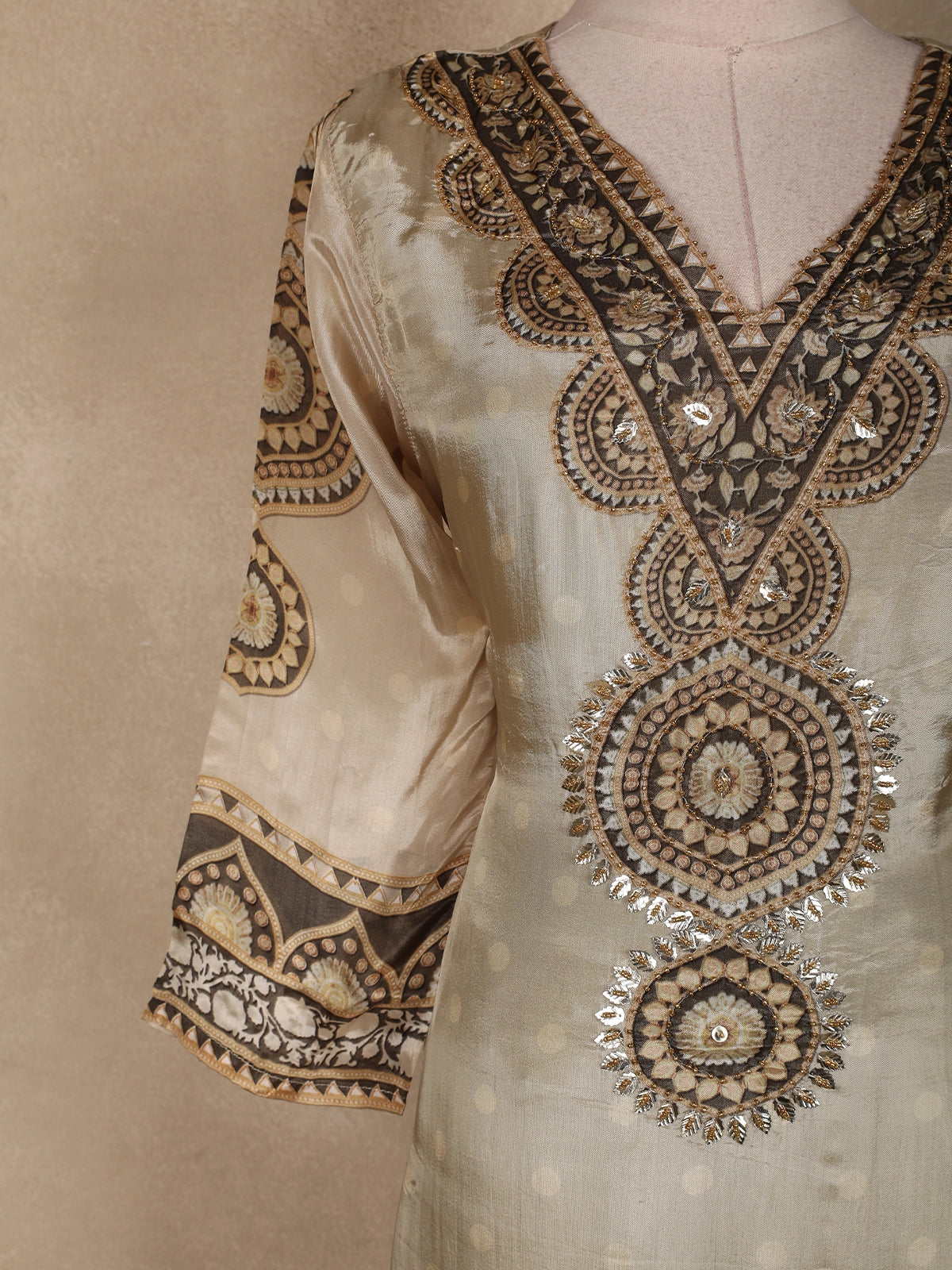 The kurta features intricate geometric and mandala-inspired prints, thoughtfully arranged across the body, neckline, sleeves, and hem. Subtle foil and mirror-like accents enhance the design, adding a gentle shimmer without overpowering the understated elegance of the ensemble. The V-neckline with printed border detailing lends a flattering silhouette, while the 3/4th sleeves are finished with coordinated print accents for a polished look.