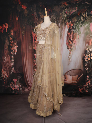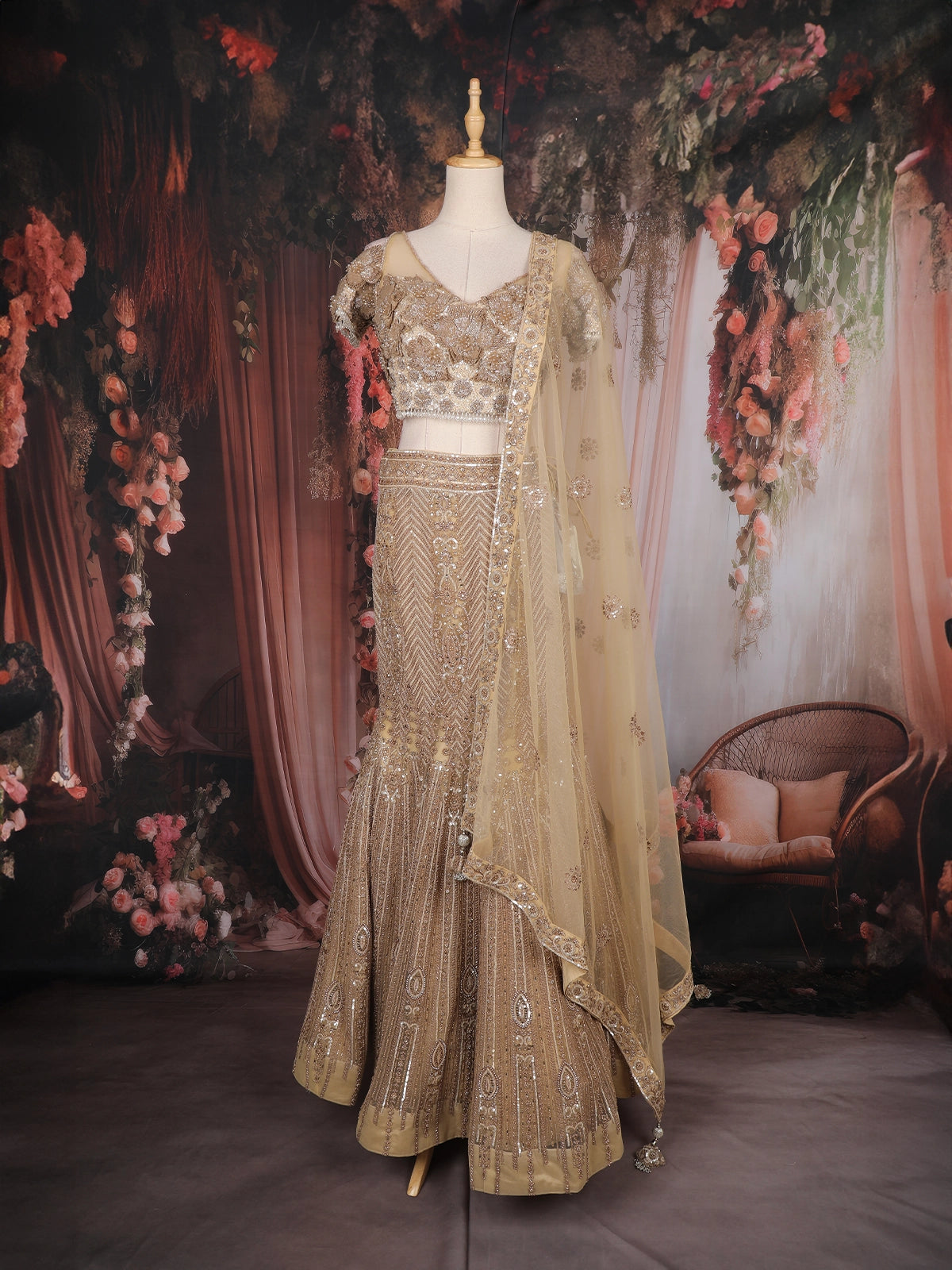 Beige Heavy Sequins and Beads Embroidered Design Mermaid Net Lehenga With Dupatta