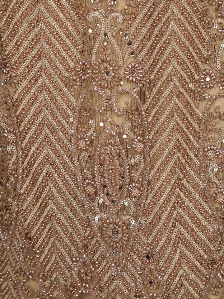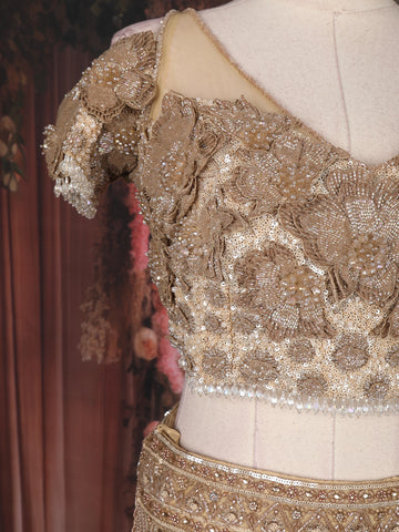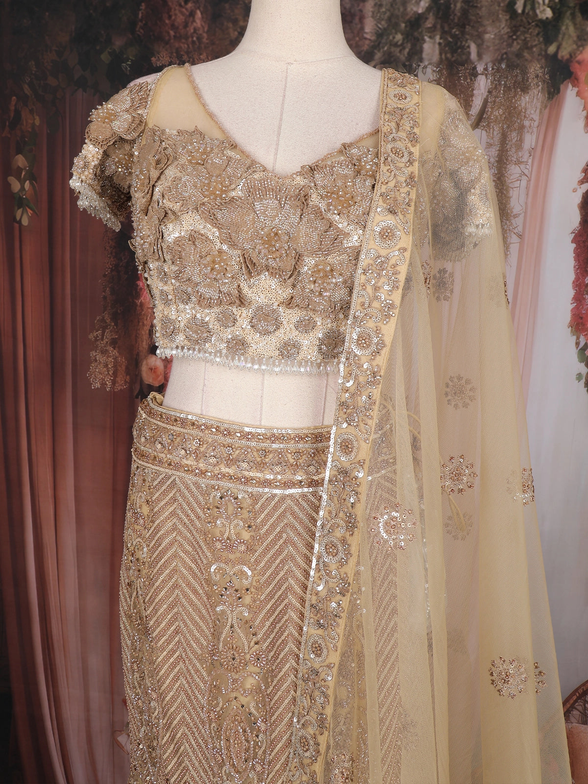 Step into timeless glamour with this Beige Heavy Sequins and Beads Embroidered Mermaid Net Lehenga, a masterpiece of luxury and craftsmanship. This exquisite ensemble is meticulously designed with intricate zari, sequin, and bead embroidery forming elegant geometric and floral motifs that shimmer beautifully under every light.