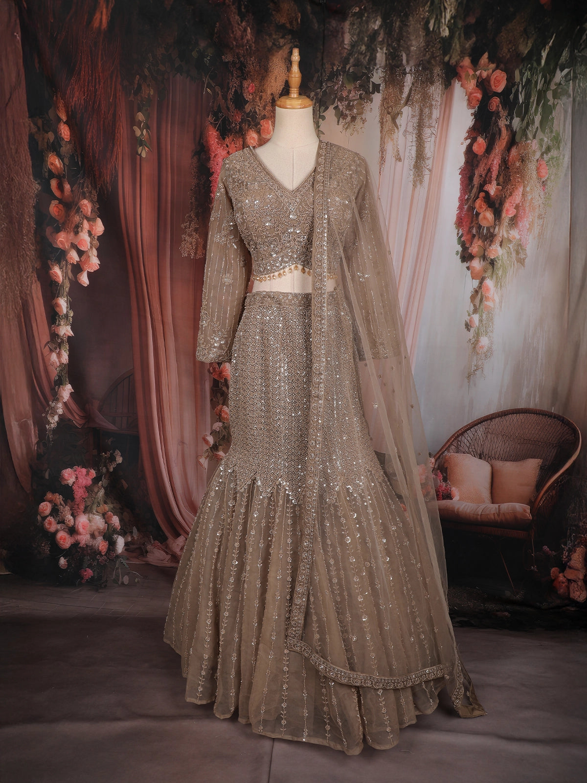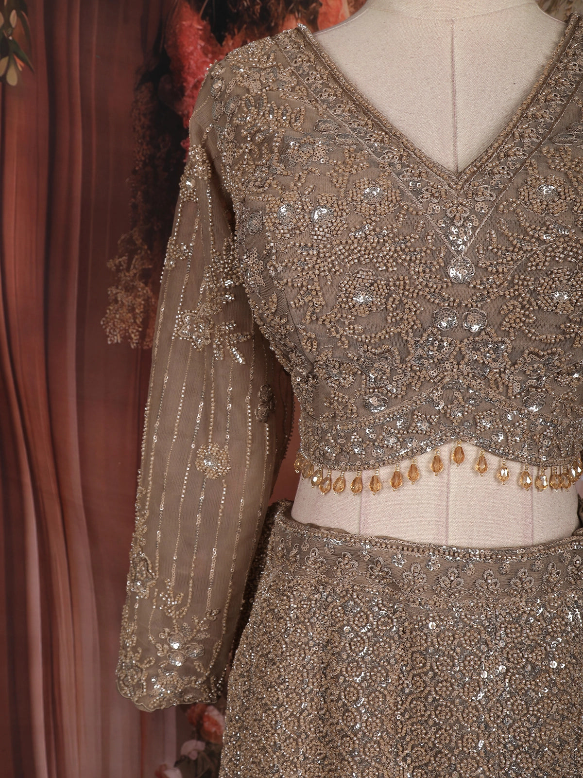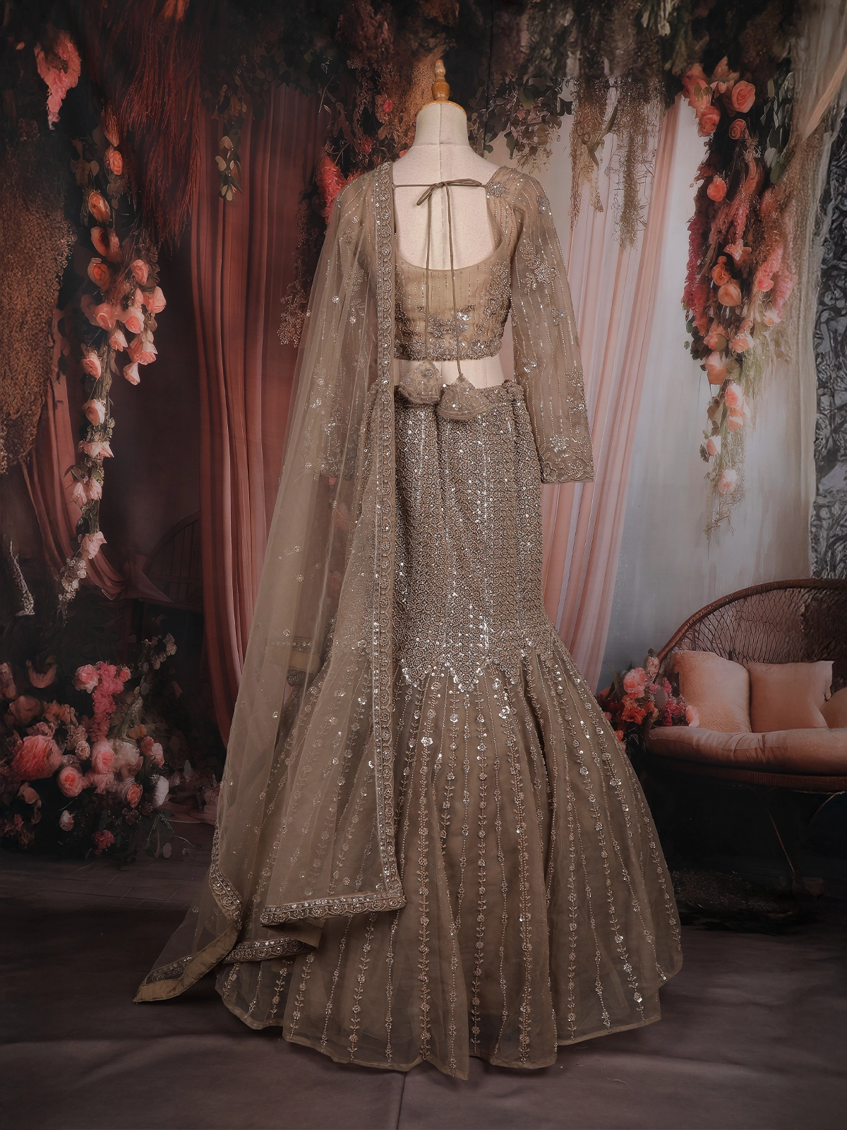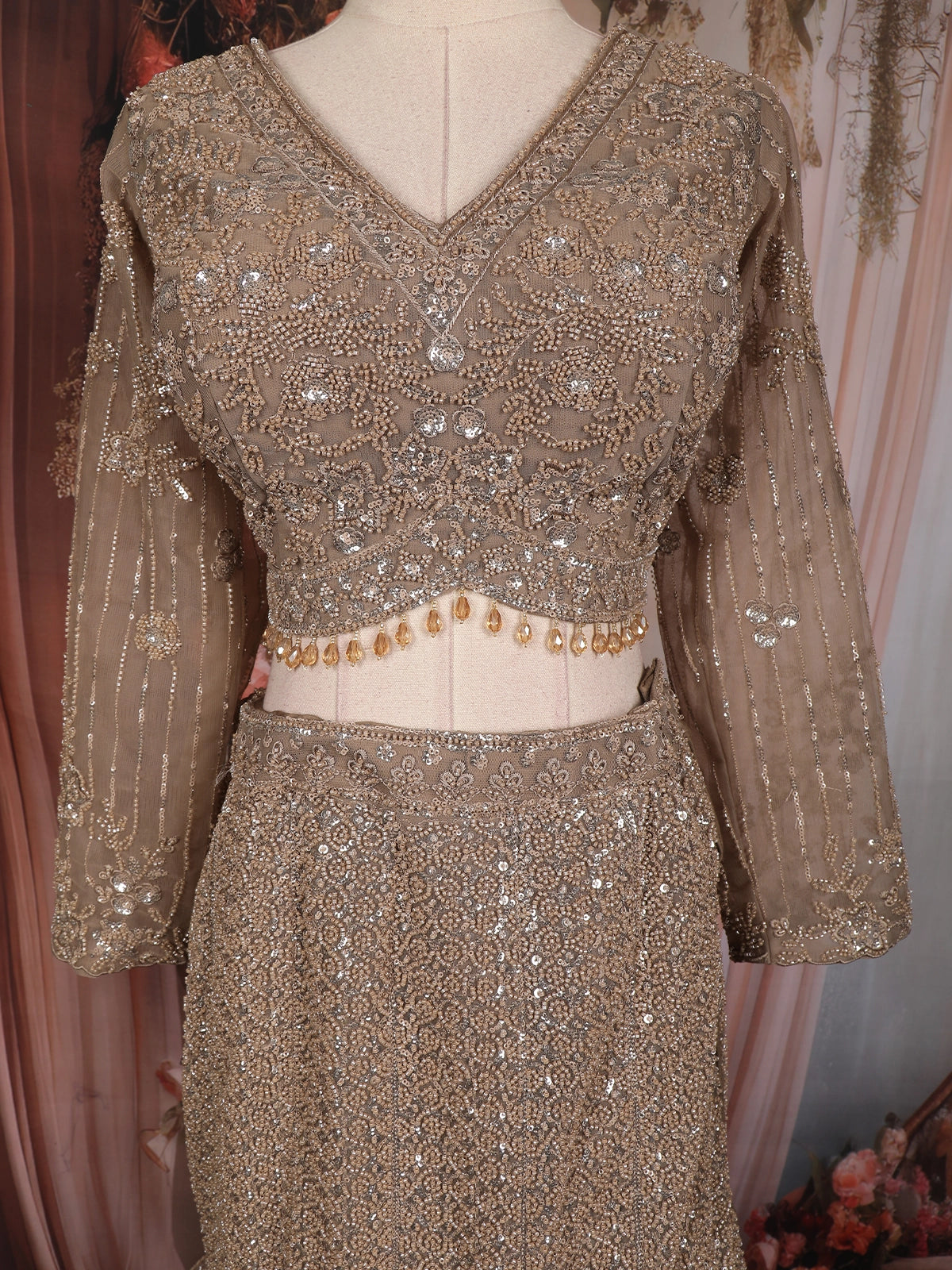 Make a striking bridal statement with this exquisite beige mermaid lehenga, crafted to embody grandeur and elegance. Designed in fine net fabric, this couture lehenga features heavy sequins and bead embroidery arranged in intricate floral and linear patterns, creating a luxurious shimmer with every movement.