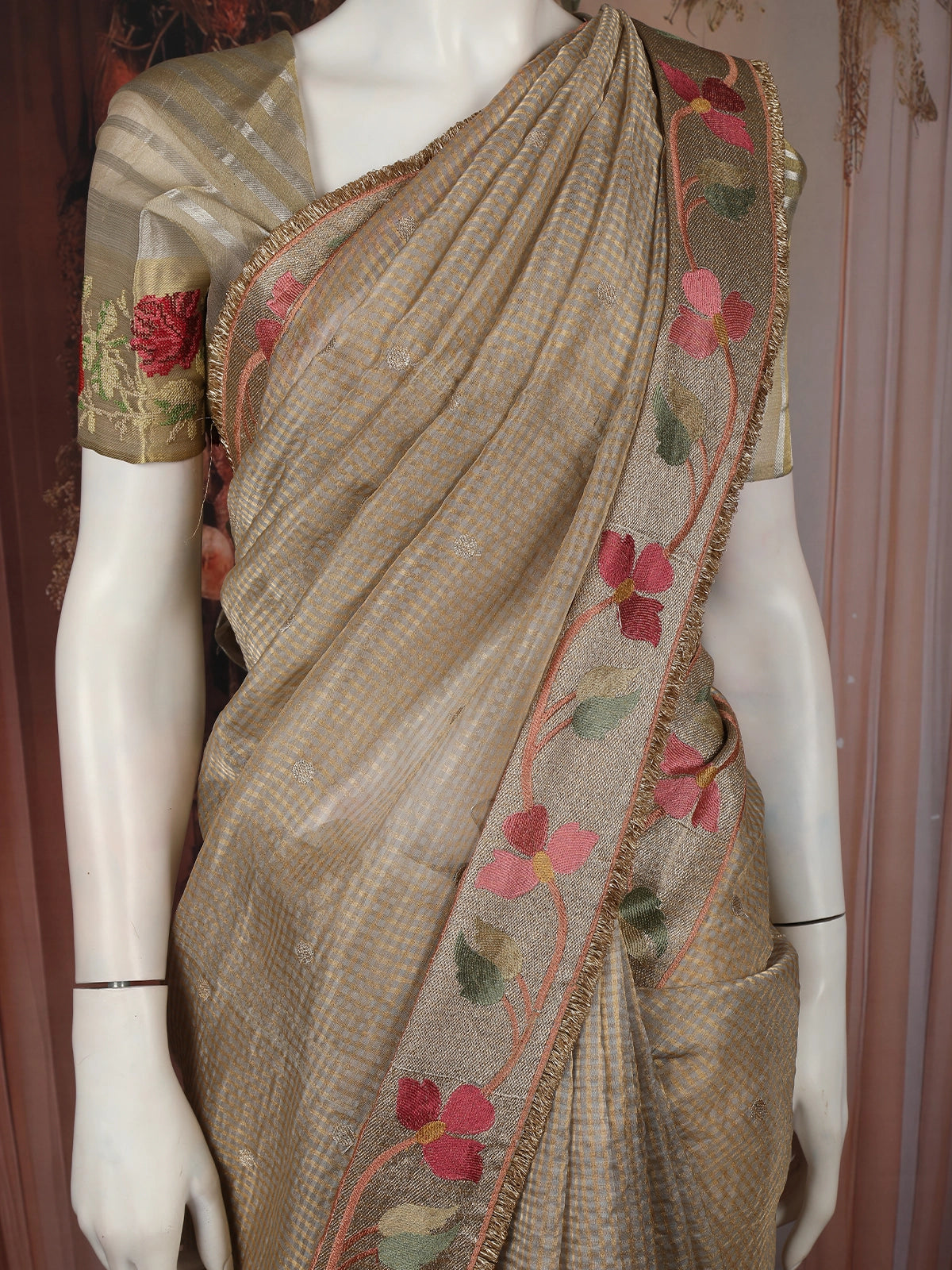 This elegant Beige Mini Checked Design Tissue Designer Saree is a graceful blend of subtle texture and refined artistry. The saree features a soft beige tissue base highlighted with delicate mini check patterns, giving it a sophisticated shimmer and a lightweight, airy drape. The understated body beautifully complements the floral embroidered border, adorned with charming blooms in soft pink and muted green tones that add a gentle pop of colour and feminine appeal.