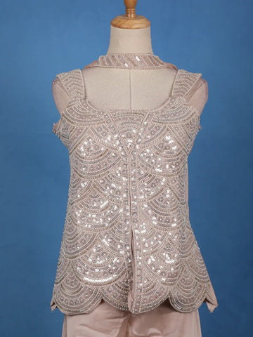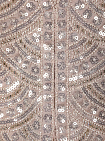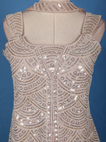 The sleeveless design with a chic neckline adds a modern touch, making it a versatile choice for cocktail parties, receptions, and evening celebrations. Its understated beige tone exudes subtle glamour, while the sequin detailing makes it a standout partywear piece.