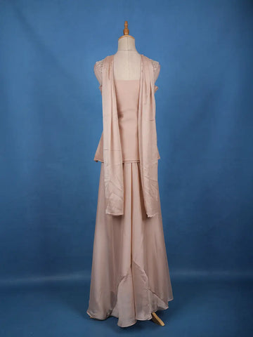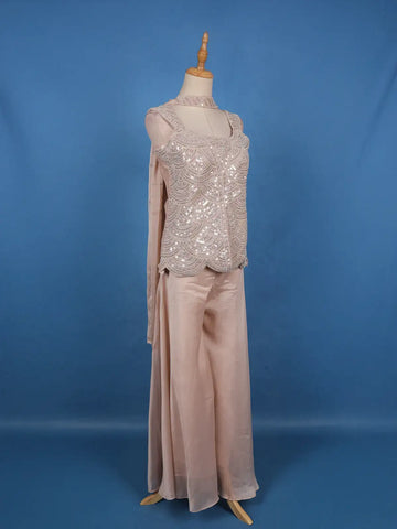 Step into refined elegance with this Beige Georgette Palazzo Suit, a perfect blend of sophistication and contemporary charm. The ensemble features a heavily sequined embroidered top, designed in an intricate scallop pattern that sparkles beautifully under light. Paired with wide-legged flowy palazzo pants in soft georgette, this outfit ensures both comfort and grandeur.