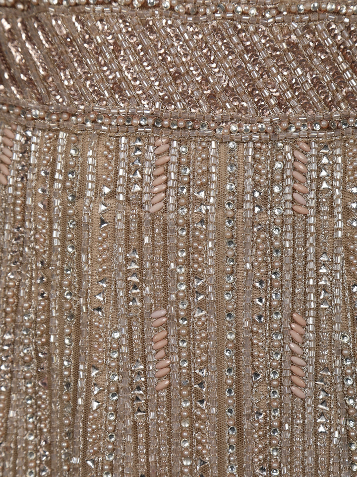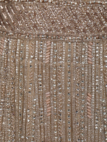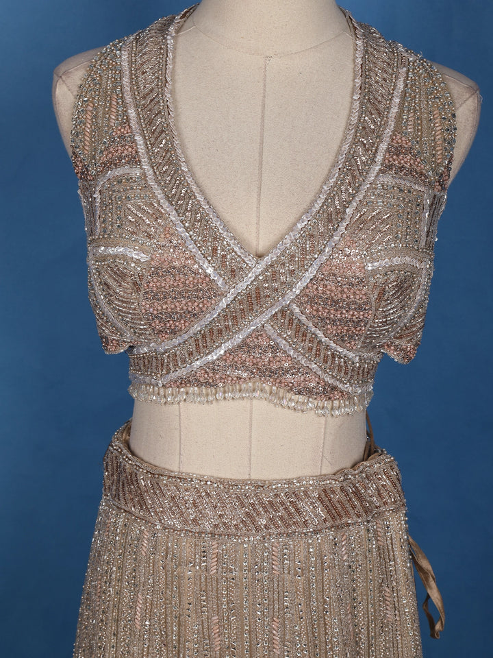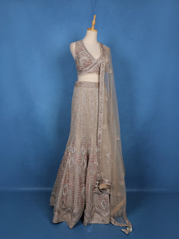 Embrace sheer sophistication with this Beige Sequins Embroidered Mermaid Net Lehenga With Dupatta, a breathtaking fusion of shimmer and grace. Crafted in delicate net fabric, this designer ensemble is meticulously adorned with dense sequin and cutdana embroidery arranged in elegant geometric and linear patterns, creating a striking play of light with every move.