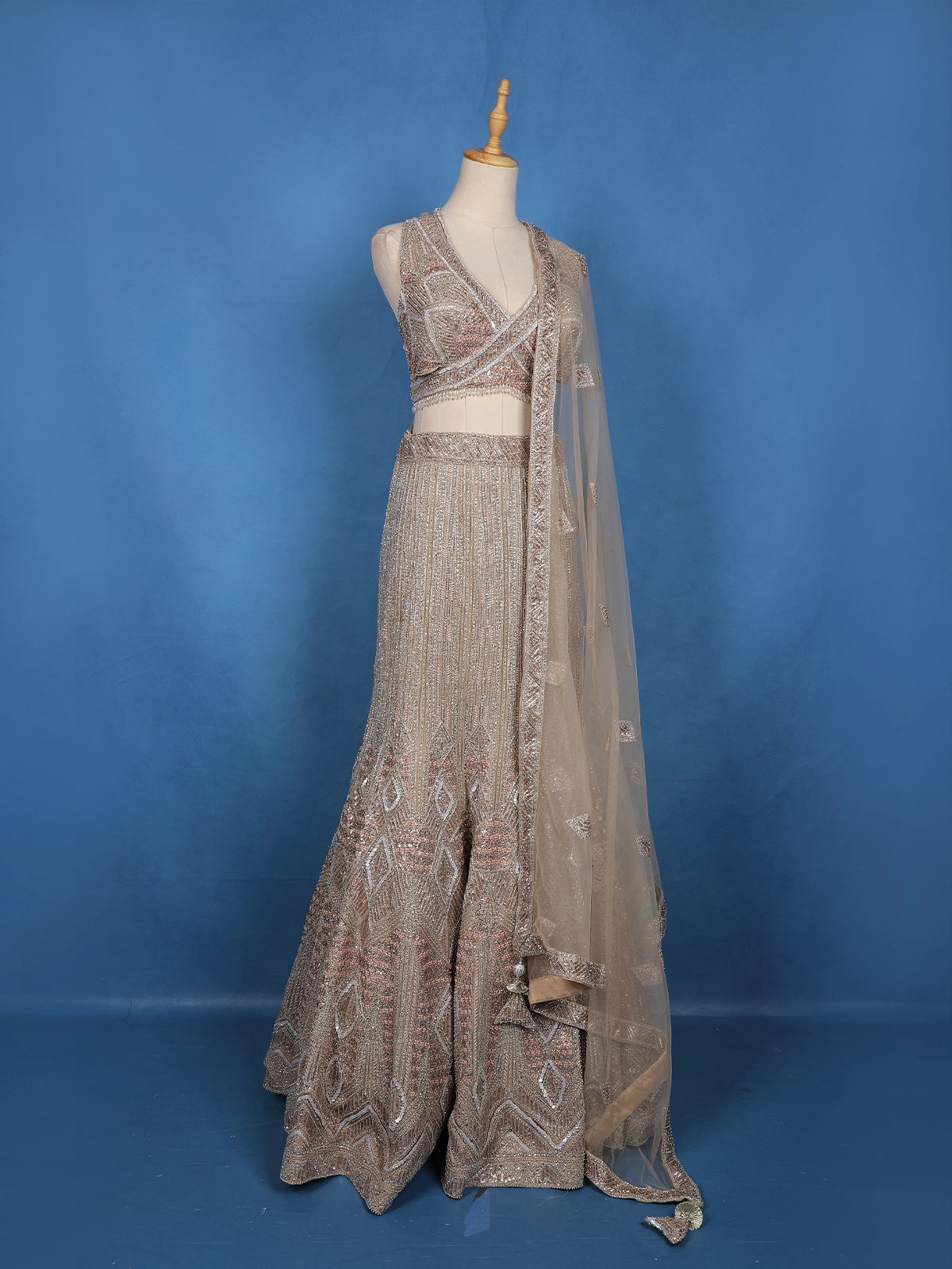Paired with a soft beige net dupatta detailed with scattered sequin motifs and an intricately embroidered border, the outfit embodies timeless allure.