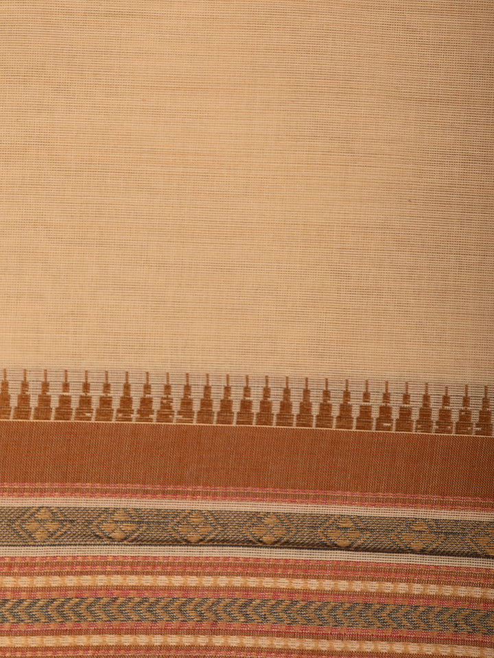 The solid beige body lends it a refined minimalism, while the woven zari border adds just the right touch of sophistication and traditional appeal. Its matching pallu and blouse piece complete the look, giving you the perfect ensemble for casual outings, family gatherings, or simple festive moments.