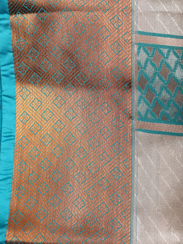 The coordinated dhoti perfectly complements the shirt with its classic beige tone and an exquisitely woven Teal and Copper Zari Border. The border highlights intricate geometric motifs, offering a rich contrast that elevates the overall traditional aesthetic.