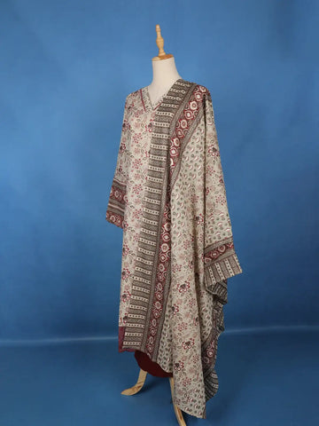 The set is paired with a solid maroon pant that balances the printed kurta perfectly. Completing the ensemble is a coordinated cotton dupatta, featuring a mix of floral and geometric motifs along the borders, lending a traditional yet stylish appeal.