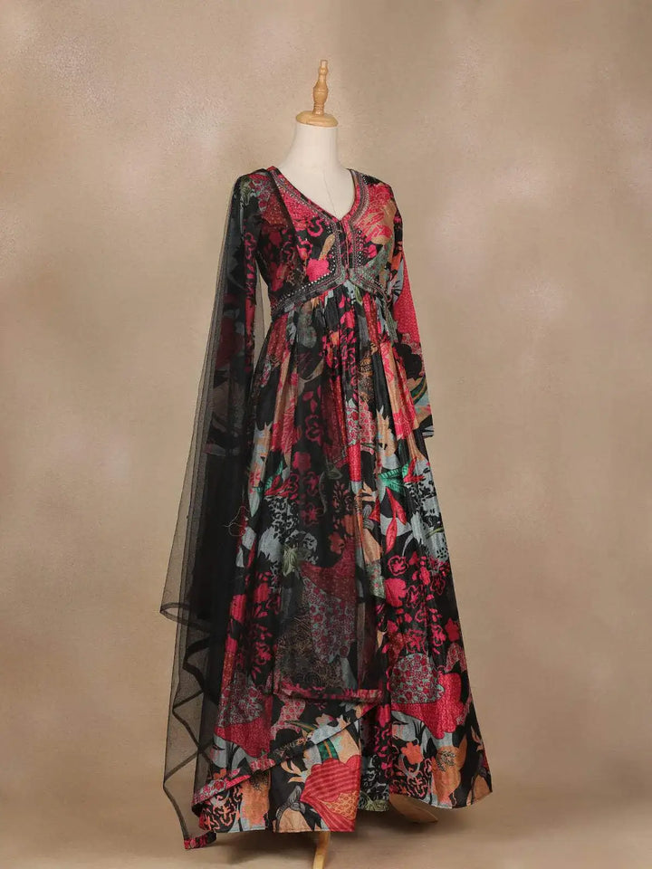 Make a stylish statement with this Black Abstract Printed Crepe Gown, designed for modern elegance with a touch of artistic flair. Crafted from soft crepe fabric, it features striking abstract prints that add a contemporary edge to the silhouette. The flattering V-neckline and full sleeves enhance its graceful look, while the matching dupatta completes the ensemble with a polished finish.