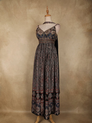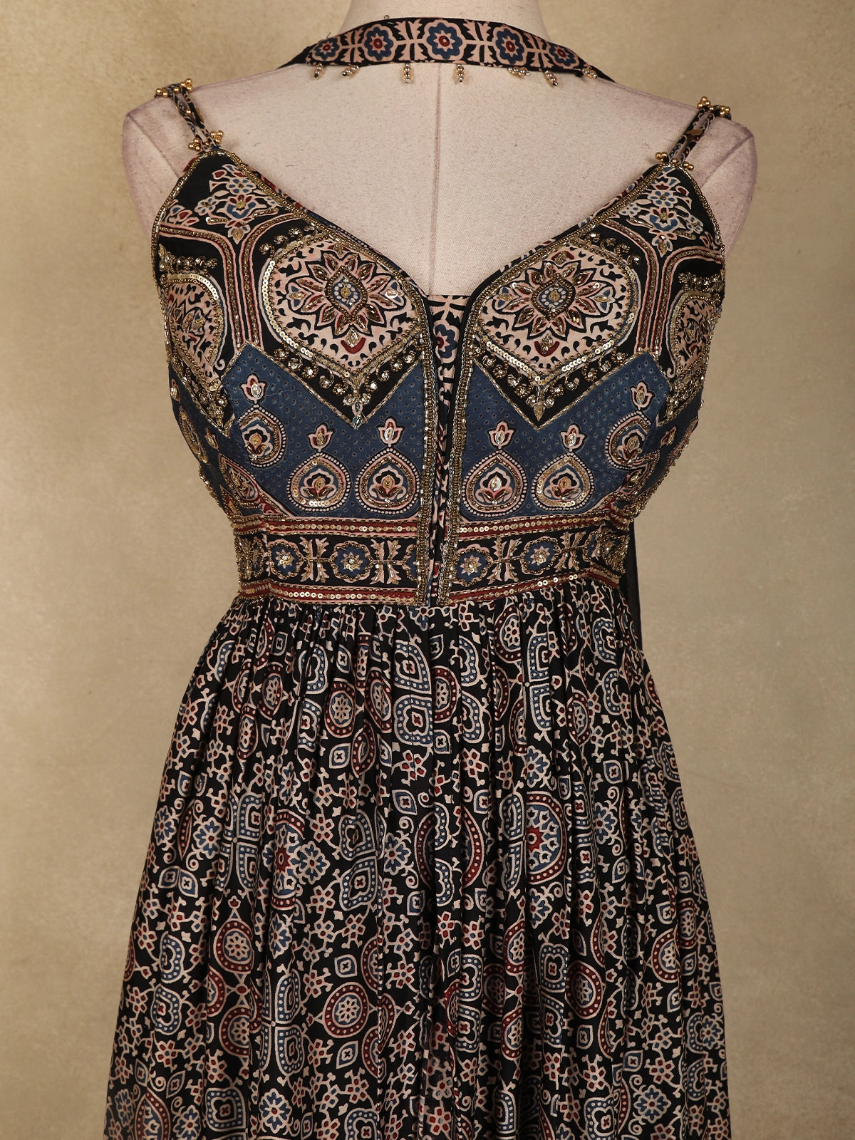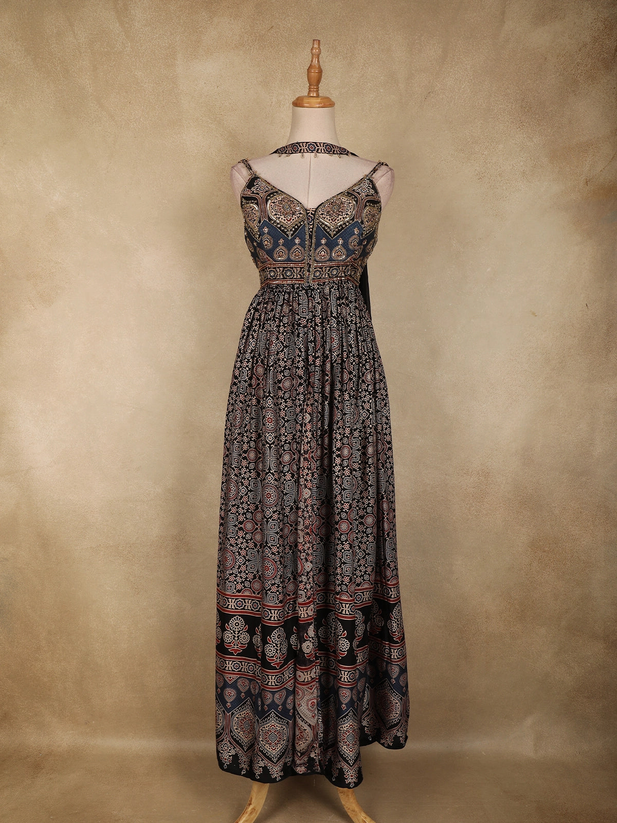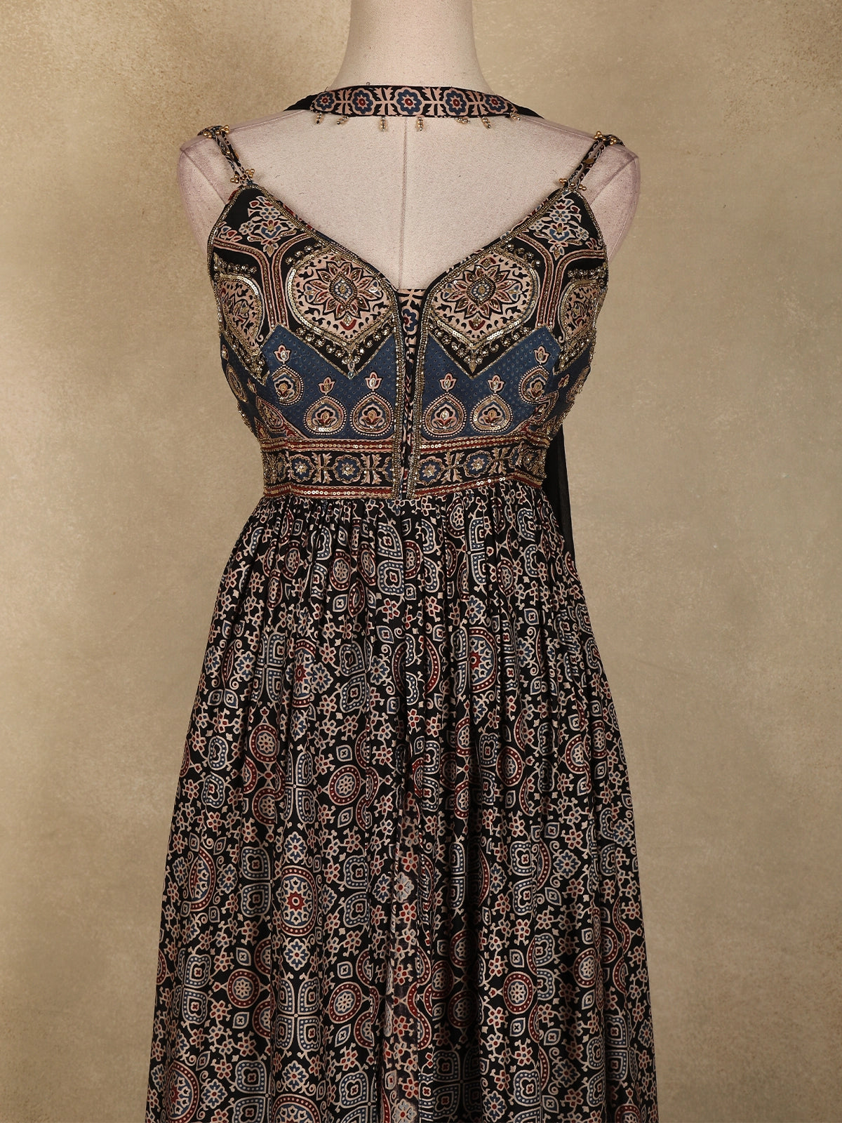 The kurti features an intricately detailed Ajrakh-inspired print, highlighted with a sweetheart neckline and slim shoulder straps that enhance the feminine silhouette. A well-defined waist panel accentuates the shape, while the beautifully coordinated prints create a rich, handcrafted appeal.